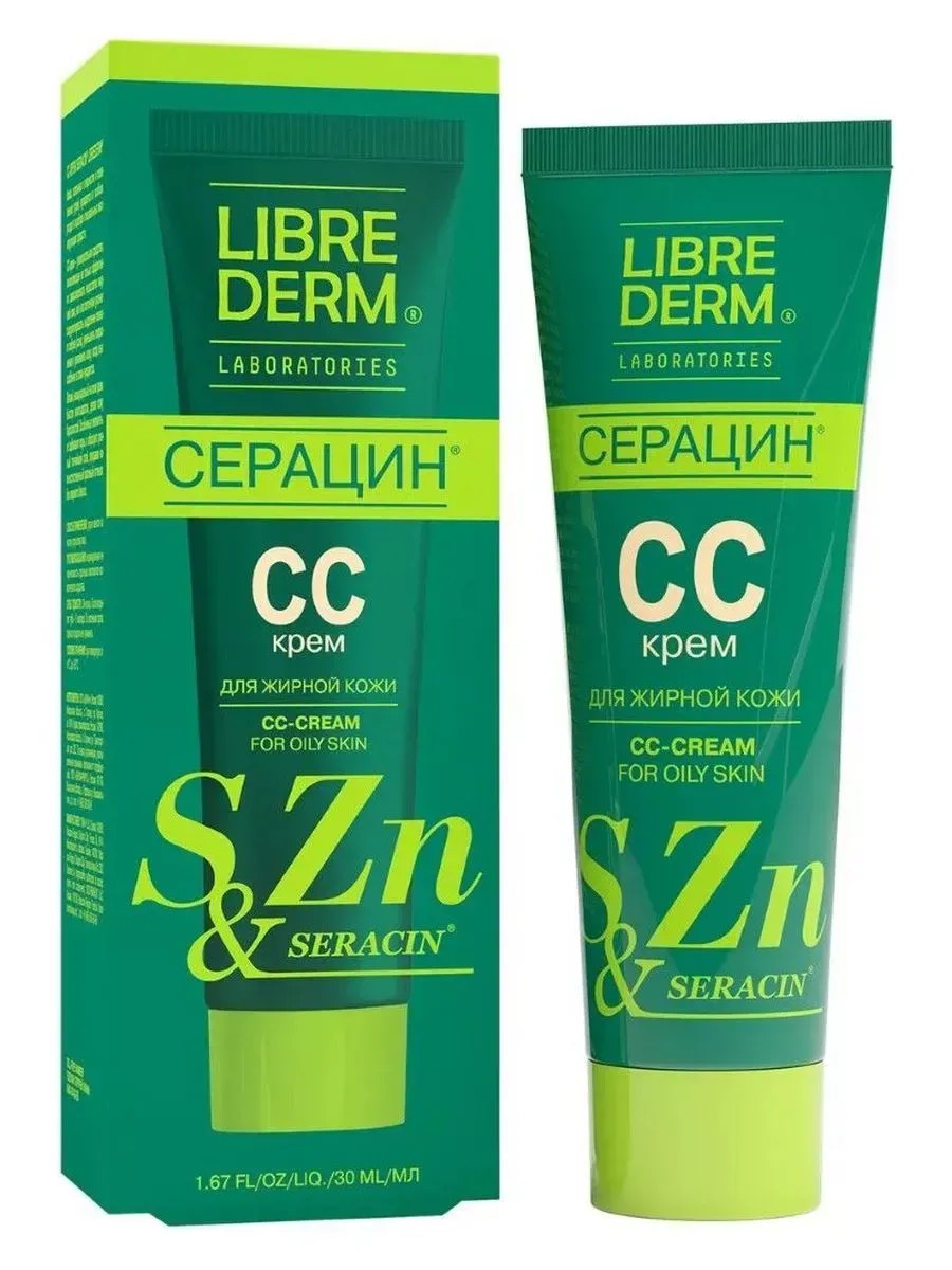 LIBREDERM SERACIN CC-CREAM 30MLLIBREDERM is an international cosmetics brand that offers modern solutions for any dermatological need. LIBREDERM is a symbiosis of scientific achievements in pharmaceuticals and modern solutions in the field of cosmetology. Librederm Seracin CC-cream is a product with a tonal shade. Appearance: - A tonal creamy product with a beige shade. CC-cream is a universal product that allows you to effectively mask the imperfections of oily skin. At the cellular level, it will correct the secretion of sebum, reduce redness and moisturize the skin. The light texture of the cream is quickly absorbed. Pigments do not clog pores, but form an even, thin layer, giving the skin a natural, beautiful shade without an oily shine. A universal product that allows you not only to effectively mask the imperfections of oily skin, but also at the cellular level to correct the secretion of sebum, reduce redness and moisturize skin when it needs it most.00