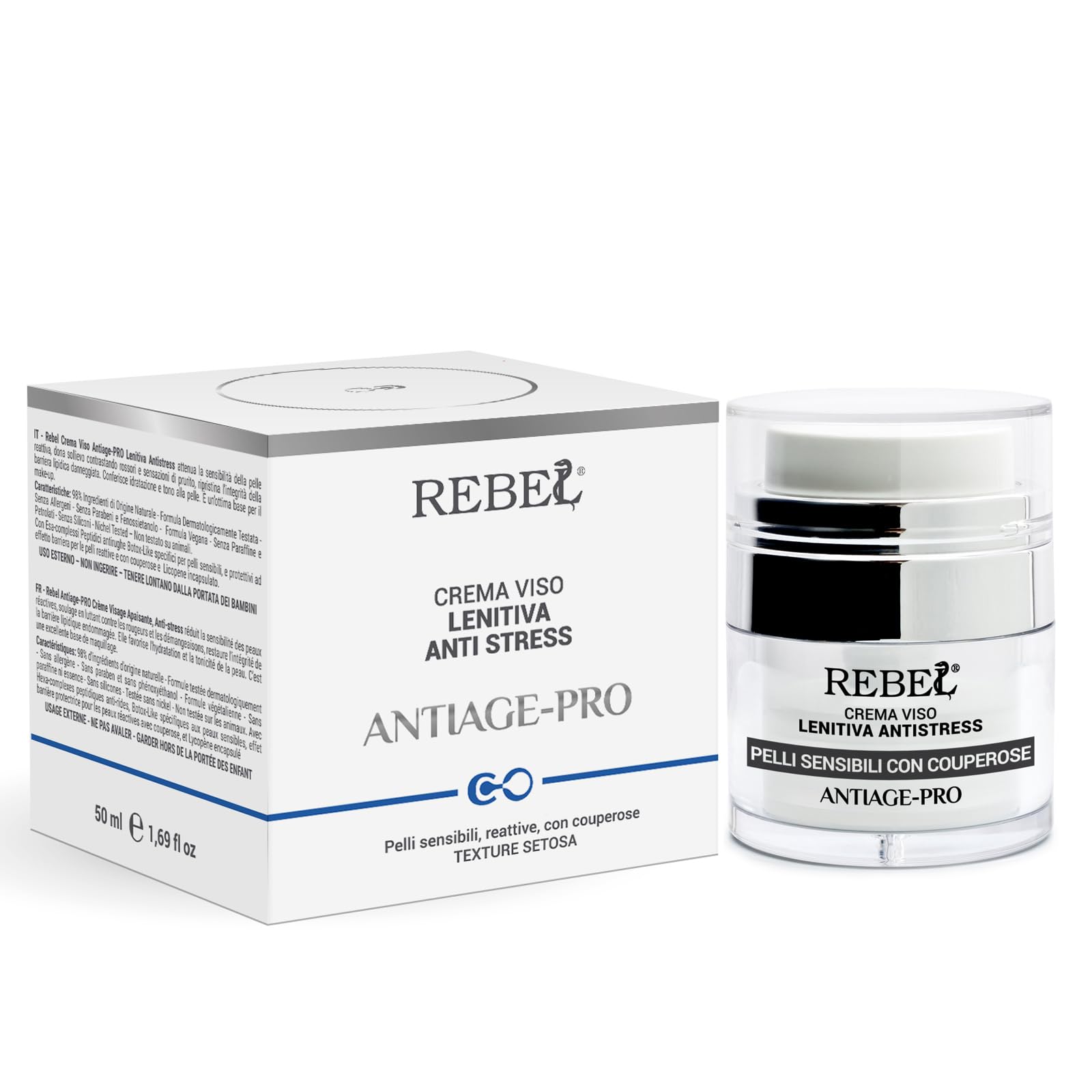 Safe and Made in Italy: Rebel Anti-Age-Pro Soothing Anti-Stress Face Cream is manufactured in Italy at the Licofarma S.r.l. production facility, adhering to all quality and safety standards. Size and Directions for Use: 50ml airless pump bottle. For best results, Rebel Anti-Age-Pro Soothing Anti-Stress Face Cream should be used morning and evening, after gently cleansing the skin. Distribute the product evenly and massage lightly to promote absorption. ? Why Choose : Formulated with 98 naturally derived ingredients, it contains no parabens, phenoxyethanol, paraffins, mineral oils, silicones, or preservatives. Allergen-free, nickel-tested, and cruelty-free. This product is made in Italy. It is specifically formulated for the treatment of sensitive skin that exhibits recurring reactivity and hypersensitivity, sagging, dullness, and wrinkles. ? Benefits : Thanks to the synergistic action of its active ingredients, it neutralizes aging while relieving redness and itching sensations and restoring the integrity of the damaged lipid barrier. Regular use of Rebel Antiage-Pro Soothing Anti-Stress Cream relaxes the skin, giving it elasticity, tone, and hydration, leaving it soft and smooth. The presence of peptides ensures an immediately visible tightening and anti-wrinkle effect. ? Indications : Rebel Soothing Anti-Stress Face Cream is an innovative anti-aging cream specifically formulated for sensitive, reactive skin or skin with rosacea. Its formula based on specific hexapeptides for sensitive and stressed skin, the special bi-peptide complex and lycopene encapsulated in plant ceramides, this cream plays an anti-aging, soothing, moisturizing and plumping action for a visible tightening effect from the first applications.Rebel Antiage Pro Crème Visage Anti-âge Apaisante Anti-stress Crème Anti-rides spécifique pour peaux sensibles, Réactives et avec Couperose Avec Peptides Effet Lifting immédiat Pot Airless 50Sûr et fabriqué en Italie : la crème visage anti-age-Pro apaisante anti-stress Rebel est fabriquée en Italie, dans l'usine de production de Licofarma S.r.l. respectant tous les standards de qualité et de sécurité. Format et mode d'utilisation : pot airless de 50 ml. Pour une meilleure efficacité, Rebel Crème Visage Antiage-Pro Apaisante Anti-Stress doit être utilisée matin et soir, précédée d'un nettoyage délicat de la peau, en répartissant le produit de manière uniforme et avec un léger massage pour favoriser l'absorption. ? Pourquoi choisir : formulé avec 98 d'ingrédients d'origine naturelle, ne contient pas de parabène, de phénoxyéthanol, de paraffines, d'huiles minérales, de silicones et de conservateurs. Sans allergène, testé pour le nickel et sans cruelté. C'est un produit fabriqué en Italie. Elle est spécifique pour le traitement des peaux sensibles et qui manifestent une réactivité et une hypersensibilité récurrentes, un flétrissement, une opacité et des rides. ? Avantages : grâce à l'action synergique de ses principes actifs, il neutralise le vieillissement, tout en soulageant les rougeurs et les sensations de démangeaisons et en restaurant l'intégrité de la barrière lipidique endommagée. L'utilisation récurrente de la crème Rebel Antiage-Pro apaisante anti-stress détend la peau en lui donnant élasticité, ton et hydratation, la rendant douce et lisse. La présence des peptides assure un effet tenseur anti-rides immédiatement visible. ? Indications : la crème visage Rebel apaisante anti-stress est une crème anti-âge innovante spécifique pour les peaux sensibles, réactives ou avec couperose. Sa formule à base d'hexapeptides spécifiques pour les peaux sensibles et stressées, le complexe spécial bi-peptidique et le lycopène encapsulé en céramides végétales cette crème joue une action anti-âge, apaisante, hydratante et repulpante pour un effet tenseur visible dès les premières applications.