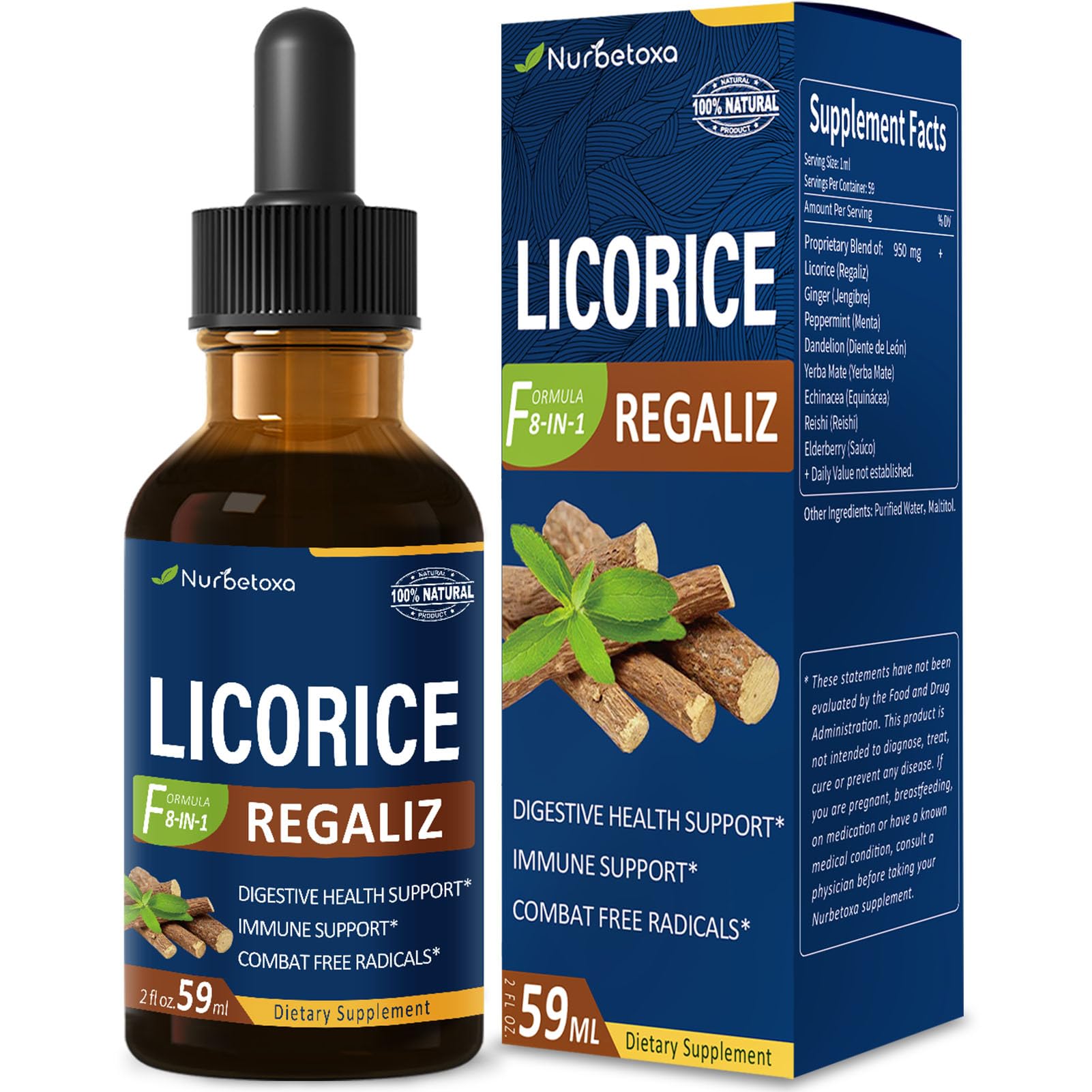 SATISFACTION GUARANTEE: Our alcohol-free tincture is made with natural, high-quality ingredients sourced from trusted suppliers and manufactured in CGMP-certified facilities. Designed for those focused on digestive health, it offers gentle yet long-lasting support. We aim to deliver excellent results. If the product doesn't meet your expectations, feel free to contact us anytime. . EASY AND EFFECTIVE: Say goodbye to hard-to-swallow pills and capsules with our Licorice liquid supplements. It offers enhanced bioavailability, with absorption by the body in just five minutes and a remarkable 98 absorption rate. Just add it to water or juice and take 1 ml, 1 to 2 times a day as needed. IMMUNE SUPPORT COMBAT FREE RADICALS: Our Licorice digestion wellness formula is also beneficial for immune function. Licorice maintains the balance of intestinal flora and enhances intestinal immunity. Paired with Echinacea, it regulates the body's immune response and natural defense. To better eliminate free radicals, our blend also contains Reishi and Elderberry. They repair immune cells and support a healthy inflammatory response, making you feel comfortable and energetic. . DIGESTIVE HEALTH SUPPORT: Licorice contains flavonoids and polysaccharides, like DGL, to support digestion, improve gut motility and protect the stomach lining. To enhance its effects, we added dandelion and yerba mate to speed up gut detox cleanse. This helps reduce constipation and improve digestion. Additionally, ginger peppermint help regulate stomach acid secretion and reduce stomach discomfort, like acid reflux and heartburn. Together, they balance your overall digestive environment. . ALL NATURAL HERBAL FORMULA: Nurbetoxa knows a ton about herbal supplements. Our global team of herbalists is really into the natural power of herbs for your health. Centuries ago, people found that Liquorice root organic can regulate digestive health and immune cell activity. Our digestive supplement is based on Asian Licorice and combines 7 other herbs, like Indian Ginger and European peppermint. All the ingredients are good for your digestion and immune system. Provide more comprehensive support. .
