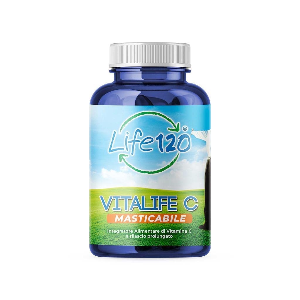 Vitamin C promotes the reduction of iron (from ferric to ferrous), making it more absorbable in the intestines and increg its bioavailability. Iron is essential for the formation of hemoglobin, red blood cells, and myoglobin in muscle tissue. This helps prevent the onset of fatigue and premature tiredness, often attributed to iron deficiency anemia. Vitamin C also supports nervous system function. It is essential for the proper functioning of the nervous system, as it is necessary for the synthesis of certain neurotransmitters and hormones, including serotonin and norepinephrine, which are helpful in maintaining a positive mood. Optimizing memory and cognitive processes is also supported by improving the integrity of blood vessels that irritate the brain. ? Stimulates collagen synthesis: Vitamin C stimulates the synthesis of collagen, the most important and abundant structural protein in the human body. Collagen provides strength and cohesion to joints, muscles, blood vessels, bones, teeth, and skin. As its name suggests, collagen holds together, for example, the different layers of the skin, giving it strength, elasticity, and tone. ? Antioxidant action: Vitamin C plays a very important antioxidant role, as it protects our vital molecules (proteins, lipids, DNA) that are attacked daily by free radicals. It also allows the regeneration of the reduced (active) form of vitamin E, forming, together with it, a protective system against cellular aging caused by oxidative stress. ? Supports the immune system: Vitamin C appears to have an immunomodulatory effect. It facilitates the movement of various immune cells in the blood, so they can more quickly reach the area targeted by pathogens. Strengthens and supports the response of neutrophils, immune system cells that represent the first line of defense against infections.? La vitamine C favorise la réduction du fer (ferrique à ferreux), le rendant plus absorbable au niveau intestinal, avec une augmentation de sa biodisponibilité : le fer est essentiel pour la formation de l'hémoglobine, des globules rouges, et de la myoglobine, dans le tissu musculaire. Tout cela permet d'éviter l'apparition de la fatigue et de la fatigue précoce, souvent attribuables à l'anémie sidéropénique (carence en fer). ? Prend en charge la fonction du système nerveux : la vitamine C est essentielle pour l'efficacité du système nerveux : en effet nécessaire pour la synthèse de certains neurotransmetteurs et hormones, y compris la sérotonine et la noradrénaline, utiles pour maintenir un bon ton de l'humeur. L'optimisation de la mémoire et des processus cognitifs est également soutenue par une amélioration de l'intégrité des vaisseaux sanguins qui irritent le cerveau. ? Stimule la synthèse du collagène : la vitamine C stimule la synthèse du collagène, la protéine structurelle la plus importante et abondante du corps humain. Le collagène apporte résistance et cohésion aux articulations, muscles, vaisseaux sanguins, os, dents et peau. Comme son nom l'indique, le collagène tient ensemble, par exemple, les différentes couches de la peau, tout en lui donnant résistance, élasticité et tonicité. ? Action antioxydante : la vitamine C a un rôle antioxydant très important, car elle protège nos molécules vitales (protéines, lipides, ADN) qui sont attaquées chaque jour par les radicaux libres. Il permet également la régénération de la forme réduite (active) de la vitamine E en constituant, avec elle, un système de protection contre le vieillissement cellulaire causé par le stress oxydatif. ? Soutient le système immunitaire : à la vitamine C, une action immunomodulatrice semble reconnue. Facilite les déplacements dans le sang de différentes cellules immunitaires, afin qu'ils puissent atteindre plus rapidement la zone attachée par les agents pathogènes. Renforce et soutient la réaction des neutrophiles, cellules du système immunitaire qui représentent la première ligne de défense contre les infections.Life 120 - Vitalife C - 90 comprimés à croquer Complément alimentaire de vitamine C à libération prolongée