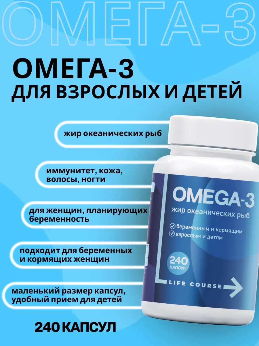 Омега 3 от LIFE COURSE - это биодобавка в капсулах, содержащая незаменимые полиненасыщенные жирные кислоты омега-3, полученные из рыбьего жира. Можно женщинам, планирующим беременность, беременным и кормящим грудью, а так же детям с 7 лет. (но рекомендуем проконсультироваться с врачом). Омега 3 жирные кислоты являются важным элементом витаминного комплекса и рекомендуются для построения клеточных мембран, обновления клеток, производства гормонов, поддержания здоровой памяти и нервной системы, снижения уровня "плохого" холестерина и риска развития атеросклероза, производства синовиальной жидкости, гибкости и подвижности суставов. Этот продукт особенно важен для людей, испытывающих серьезные физические и стрессовые нагрузки, а также для тех, кто не употребляет достаточно рыбы и морепродуктов. Регулярная поддержка организма с омега-3 в капсулах способствует высокой концентрации внимания, так как витамины для мозга и памяти способствуют повышению умственной работоспособности. Рекомендации к применению: взрослым, в том числе женщинам, планирующим беременность, беременным и кормящим грудью, детям с 7 лет и старше по 4 капсулы (массой 300 мг) 2 раза в день во время или после еды; или по 2 капсулы (массой 500 мг или 700 мг) 2 раза в день во время или после еды. Продолжительность приема - 1 месяц. При необходимости можно повторить.