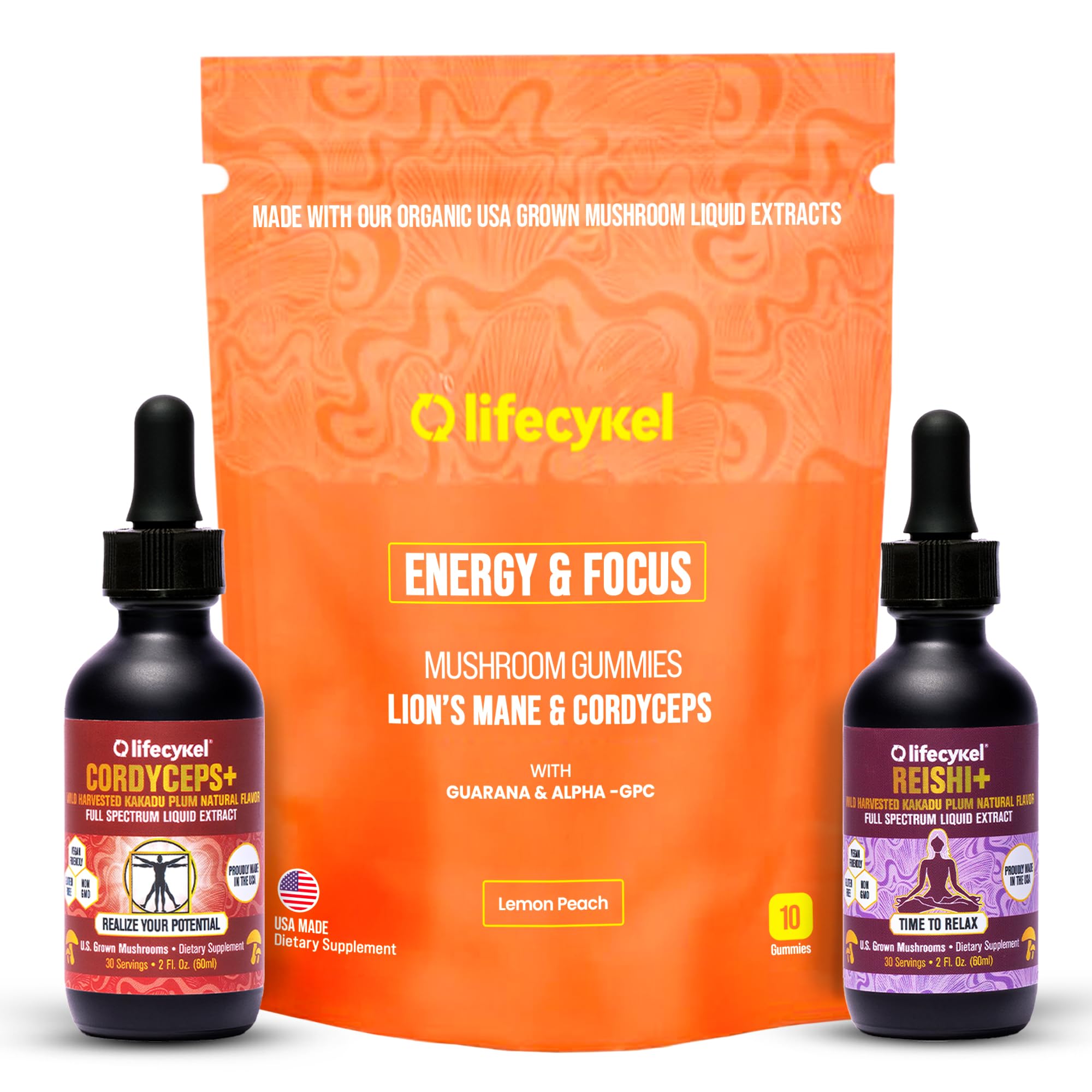 Lifecykel Quality You Can Trust: Lab-tested for purity and potency, these premium Lifecykel mushroom extract formulas offer safe, effective natural health benefits to enhance your mushroom supplement wellness routine. Convenient Liquid Extract Gummies: Includes easy-to-use tinctures plus a 10-count of focus gummies for adults, designed to elevate mental alertness and support daily vitality with a powerful liquid mushroom supplement. Immune Support Stress Relief: Reishi mushroom supplement supports a healthy immune system while helping to reduce stress and promote calmness, mental clarity, and emotional balance as a natural liquid immune support formula. Sustained Energy Physical Endurance: Cordyceps extract promotes increased stamina and physical performance, delivering a natural, long-lasting energy and focus supplement to keep you active and mentally sharp all day long. Dual-Power Mushroom Extracts: This duo of 1oz liquid extracts combines cordyceps mushroom extract and reishi mushroom tincture to naturally boost energy, support immunity as a powerful immune defense supplement, and enhance overall vitality for balanced daily wellness.