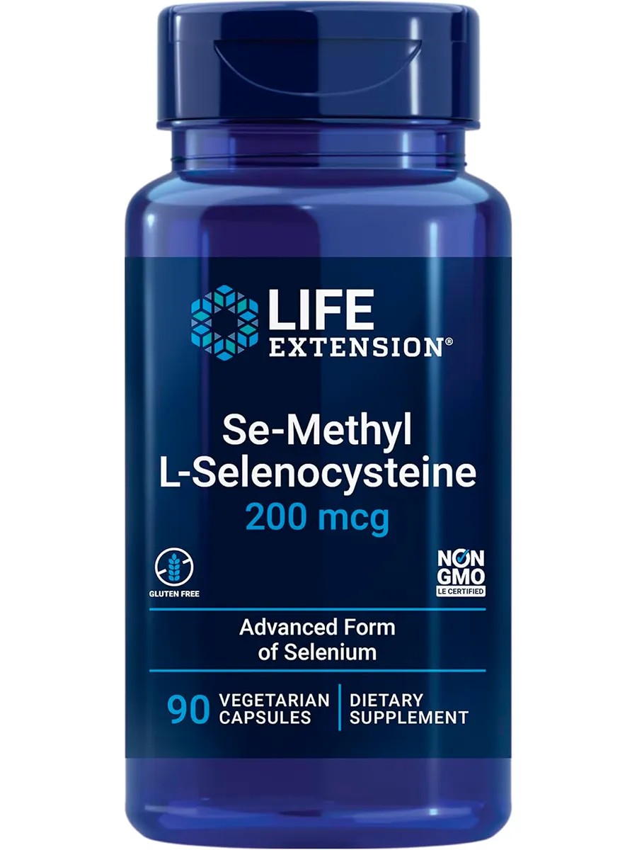 Se-Methyl L-Selenocysteine 200 mcg, 90 Vegetarian Capsules. Life Extension Se-Methyl L-Selenocysteine 200 mcg 90 Capsules An advanced form of the antioxidant selenium. Se-Methyl L-selenocysteine is a naturally occurring selenium compound that helps protect cells and tissues from oxidative damage and supports both healthy cell function and cell division. Non-GMO, Vegetarian What is Se-Methyl L-Selenocysteine from Life Extension? Selenium is incorporated into proteins to form selenoproteins, which are important antioxidant enzymes that help block free radical damage to cells and support healthy cell function. Se-Methyl L-selenocysteine (SeMC) is a naturally occurring selenamino acid that is synthesized by plants such as garlic and broccoli. Clinical studies have shown that Se-methyl L-selenocysteine is absorbed faster than other forms of selenium. Benefits of Se-methyl-L-selenocysteine life extension Supports healthy cell function and cell division Helps protect cells and tissues from oxidative damage Optimizes thyroid hormone synthesis and activity Supports immune health Get the selenium you need Selenium is an essential trace mineral for human health. In the body, it is incorporated into enzymes and other proteins, forming vital compounds known as selenoproteins. Se-Methyl L-selenocysteine (MSeC) is an organic selenium compound that is better absorbed than inorganic selenium salts commonly used in supplements. Product Information Selenium is an essential trace mineral for human health. In the body, it is incorporated into enzymes and other proteins, forming vital compounds known as selenoproteins. Perhaps the most well-known selenoprotein is the antioxidant enzyme glutathione peroxidase. Each glutathione peroxidase molecule requires four selenocysteine units and catalyzes the reaction in which free radicals are scavenged by glutathione. Dosage and Usage: Take one (1) capsule daily with food, or as recommended by a healthcare practitioner. Warnings: Keep out of reach of children. Do not exceed the recommended dose.
