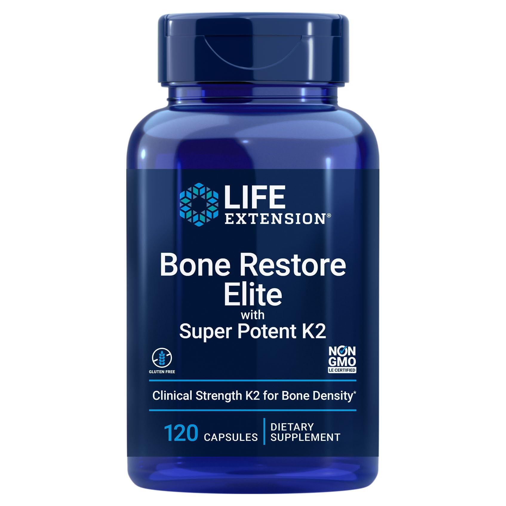 Life Extension Bone Restore Elite with Super Potent K2 - Clinically Studied Vitamin K2 Dose & Calcium Promotes Bone Health & Density - Gluten-Free Non-GMO - 120 Capsules
