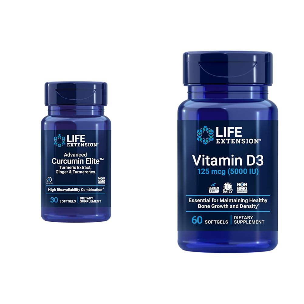 This bundle combines Life Extension's Advanced Curcumin Elite Turmeric Extract capsules with their Vitamin D3 softgels to promote whole-body health. The Advanced Curcumin Elite uses a proprietary blend of highly bioavailable curcumin from turmeric, fenugreek fibers, turmeric oil compounds, and ginger extract. With 45 times more absorbable free curcuminoids than standard curcumin, this advanced formula helps inhibit inflammation, protects cells from free radicals, and supports joint, heart, digestive, immune, and brain health. Turmeric has been used for centuries in Ayurvedic traditions for its health properties. By adding complementary ginger extract and turmerones from turmeric oil, Advanced Curcumin Elite further encourages healthy inflammatory response and immune function. The included Vitamin D3 provides a 125 mcg daily dose to help maintain healthy bone, brain, immune, and cardiovascular function. Clinical research shows proper vitamin D3 levels may mitigate age-related cognitive decline. This vitamin D3 is sourced from high quality ingredients and is non-GMO and gluten-free. Together, the Advanced Curcumin Elite and Vitamin D3 offer a powerful combination to promote whole-body wellness with anti-inflammatory turmeric, immune-boosting ginger and vitamin D3, and antioxidants to protect cell health.
