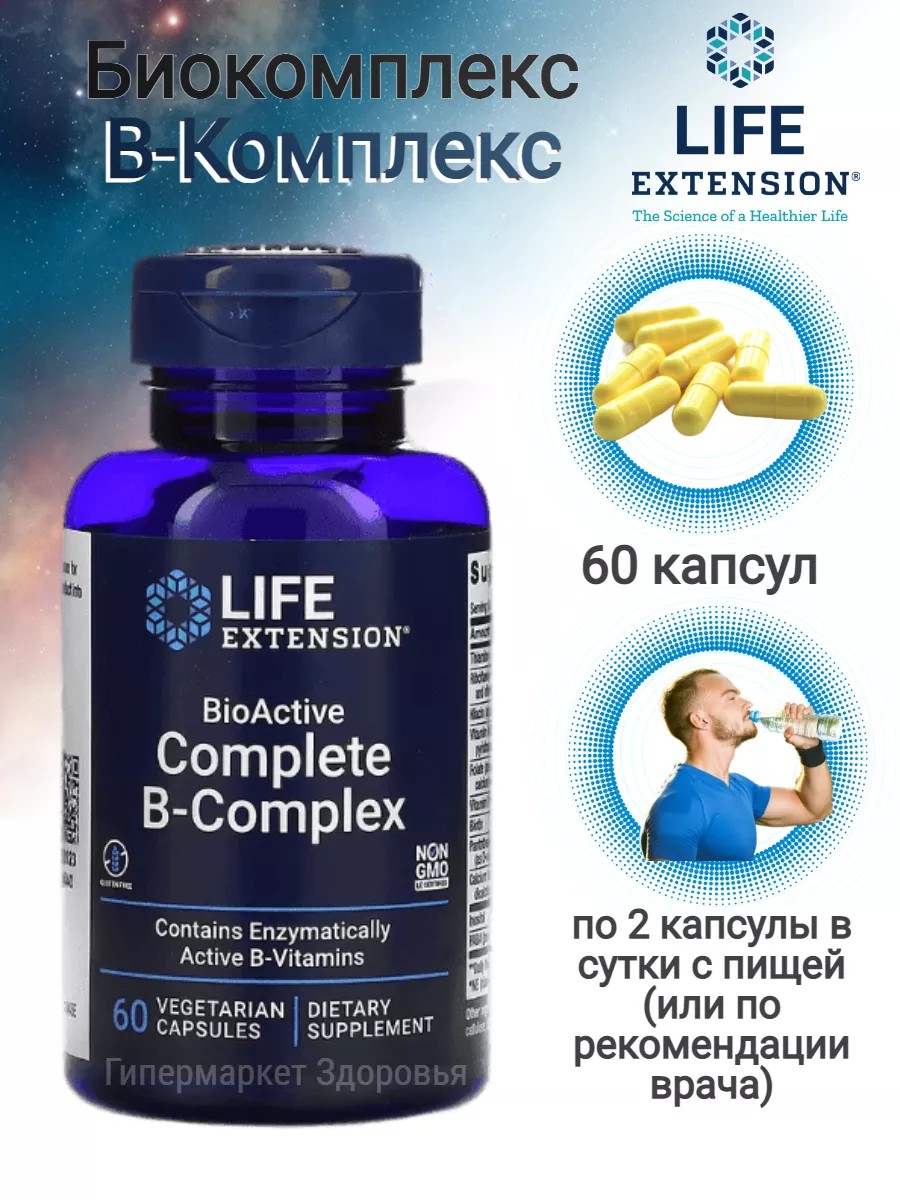 BioActive Complete B-Complex Life Extension — это мощный комплекс витаминов группы B, созданный для взрослых женщин и мужчин, заботящихся о здоровье нервной системы, мозга, сердца, сосудов, кожи, волос и ногтей. Этот комплекс включает витамины B1, B2 (рибофлавин), B3 (ниацин), B6, B7 (биотин biotin), B9 (б9 фолат, известный как фолиевая кислота), B12 (б12, метилкобаламин) — всё в коэнзимной форме, включая пиридоксаль-5-фосфат и рибофлавин, что обеспечивает высокую биодоступность и активное участие в обмене веществ.