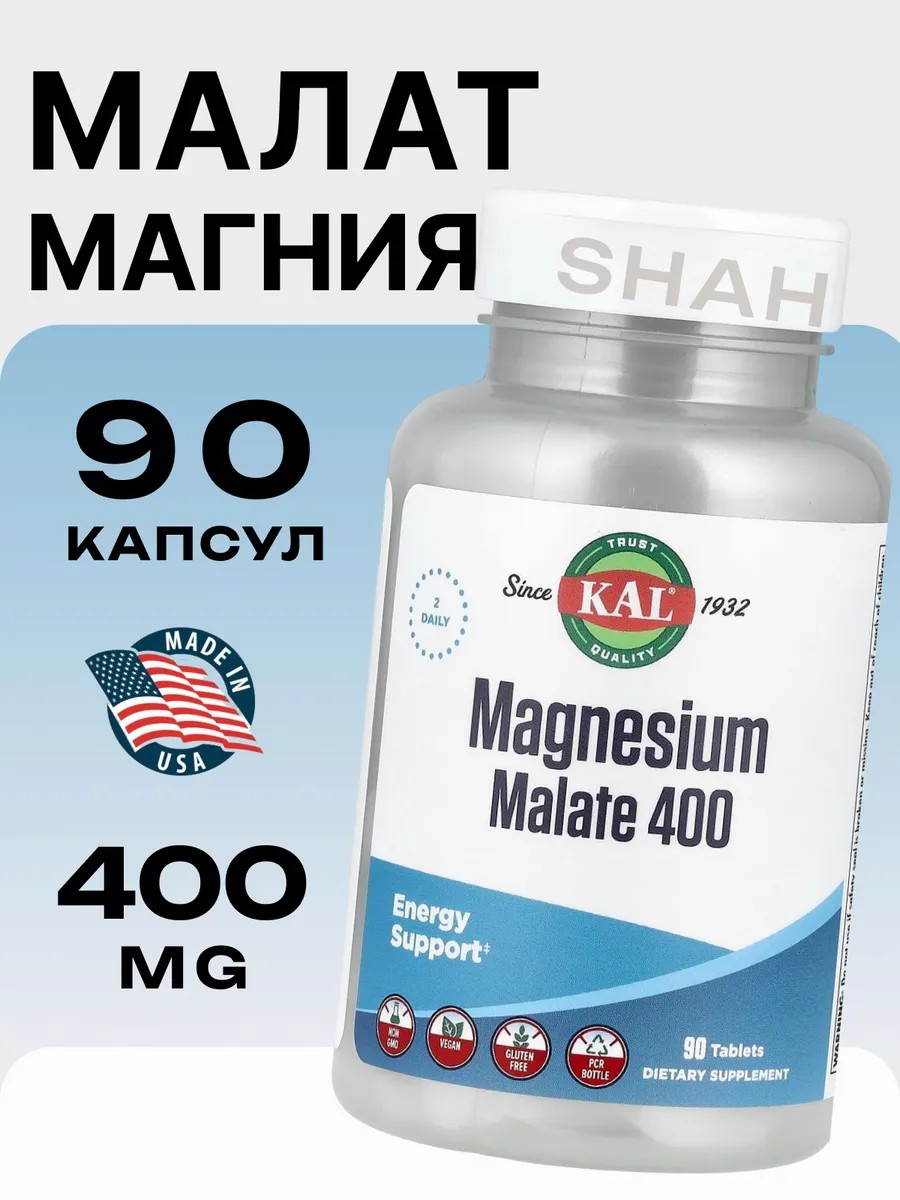 Magnesium Malate 400 мг от KAL – магний малат в таблетках. Добавка повышает энергичность, умственную работоспособность и стрессоустойчивость, помогает при мышечных спазмах, хронических головных болях, облегчает процесс засыпания. Спортсмены могут принимать магний малат для повышения выносливости, быстрого восстановления мышц после тренировок. Продукт подходит вегетарианцам, содержит высококачественный хелатированный легко усваиваемый магний.