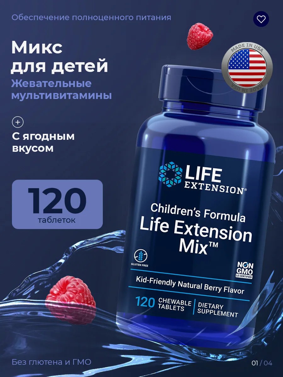 Life Extension Формула поливитаминов для детей со вкусом ягод, — без глютена, без ГМО — 120 жевательных таблеток. --ПРЕИМУЩЕСТВА:-- Стимулирует питательный баланс с помощью ежедневной добавки с несколькими питательными веществами; Способствует здоровому росту и развитию детей; Содержит привлекательный ягодный вкус без добавления сахарозы. Детям нужна прочная пищевая основа для роста и развития, поэтому важно следить за тем, чтобы они питались сбалансированно. Однако из-за напряженного графика и употребления продуктов быстрого приготовления или полуфабрикатов дети могут не получать всю рекомендуемую суточную норму питательных веществ. На самом деле, исследователи обнаружили, что дефицит питательных веществ часто встречается у детей, и поливитаминные/минеральные добавки могут быть важной частью удовлетворения ежедневных потребностей в питательных веществах. Ежедневная добавка с несколькими питательными веществами может помочь обеспечить их питанием, необходимым для того, чтобы они росли сильными и здоровыми. Детская формула Life Extension Mix содержит питательные вещества, содержащиеся в Life Extension Mix, в количествах, подходящих для детей от четырех лет и старше. Каждая легко разжевываемая таблетка содержит необходимые минералы и витамины, в том числе A, D и C, которые важны для здорового развития и роста ребенка. Любая добавка хороша только в том случае, если ребенок готов ее принимать. Родители знают, что дети могут быть привередливы ко вкусу, независимо от того, насколько они питательны. Детская формула Life Extension Mix имеет приятный ягодный вкус и теперь не содержит сахарозы. --РЕКОМЕНДАЦИИ ПО ПРИМЕНЕНИЮ: -- Детям в возрасте 4–8 лет разжевывать по две (2) таблетки в день во время еды или в соответствии с рекомендациями врача. Для детей в возрасте до 4 лет проконсультируйтесь с врачом перед использованием. --ПРЕДУПРЕЖДЕНИЕ: -- Хранить в недоступном для детей месте.