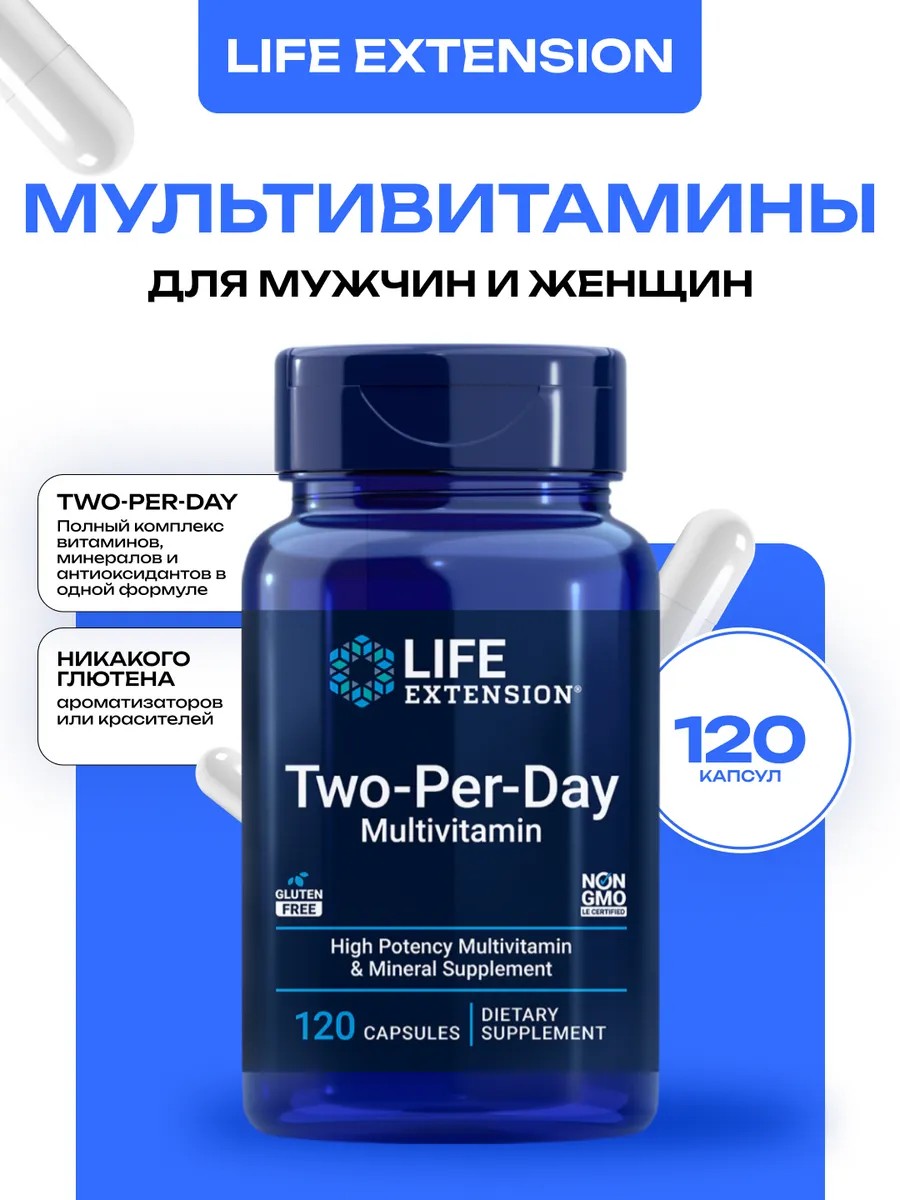 Life Extension Multivitamin, Two Per Day is a high-quality product designed to support the health of men and women. This multivitamin includes vitamins and minerals necessary for overall well-being. Multivitamins for men contain key elements, such as zinc for men, which plays an important role in maintaining health and the immune system. Sports vitamins for men help fill nutrient deficiencies that occur during intense physical activity and support energy and endurance. Multivitamins for men are designed specifically to meet the needs of the male body, supporting cardiovascular health, bones, and joints. Multivitamins for women are tailored to the unique needs of women, supporting healthy skin, hair, and nails, as well as hormonal balance. These multivitamins are suitable for daily use, providing the body with all the necessary elements. Life Extension Multivitamins, Two Per Day include easily absorbable supplements and vitamins that help maintain optimal nutrient levels in the body. This vitamin complex is the ideal choice for those who strive to maintain their health and activity at a high level.
