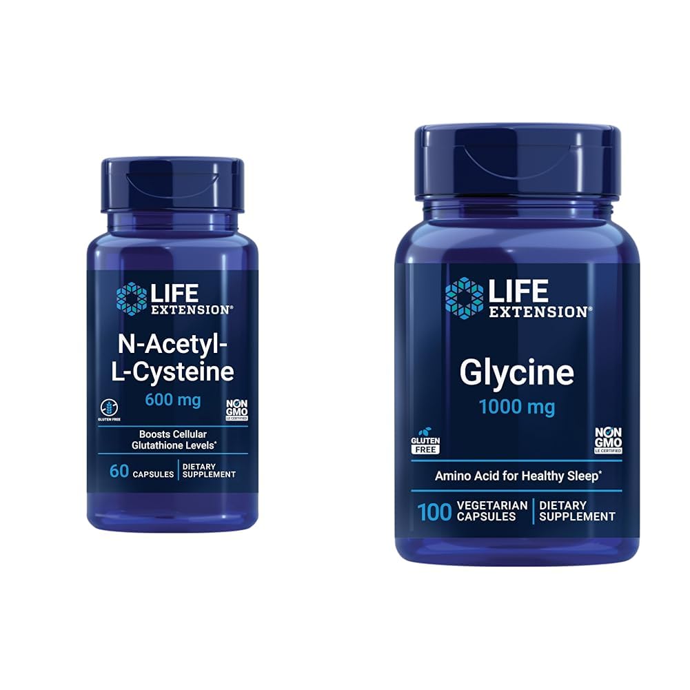 Life Extension N-Acetyl-L-Cysteine (NAC), immune, respiratory, liver health, NAC 600 mg, potent antioxidant support, free-radicals, easy to absorb, 60 capsules N-acetyl-L-cysteine is an easily-absorbed nutrient with potent benefits for whole body health. N-acetyl-L-cysteine is a highly bioavailable nutrient that supports bronchial and respiratory health. N-acetyl-L-cysteine supports healthy glutathione levels at the cellular level. Glutathione is a potent antioxidant which helps protect neurons from oxidative stress and insults from foreign compounds. N-acetyl-L-cysteine also offers powerful support for liver and immune function. Life Extension Glycine 1000 mg, Promotes Relaxation, Healthy Sleep, Amino Acid, Gluten-free, Non-GMO, Vegetarian, 100 capsules The essential amino acid, glycine, has been studied to have a calming effect on the brain. To provide the maximum benefits, we formulated our Glycine with 1000 mg, a significantly higher dose than many traditional glycine supplements. Our glycine supplement is gluten-free, vegetarian, and is made 100 non-GMO ingredients.Product 2: INGREDIENTS MATTER - Sourced using only the finest raw ingredients with the purity and quality your body deserves. The majority of our products are non-GMO, gluten-free and manufactured in the USA. A Certificate of Analysis is available for all our products. Product 2: HEALTHY DOSE - Glycine supports muscle mass and healthy body composition. Our glycine supplement provides 1000 mg of glycine per single gluten-free, vegetarian capsule. Product 2: STAY CLEAR HEADED - Research shows that, when taken before bed, glycine may promote healthy, quality sleep without causing daytime drowsiness. Product 2: CALMING SLEEP SUPPORT - Glycine is considered a semi-essential amino acid that is produced naturallyby the body and has a calming effect on the brain. Because of this, glycine promotes relaxation and soundsleep. We formulated our glycine with 1000 mg, a significantly higher dose than many traditional glycine supplements, to provide the maximum benefits. Product 1: Ingredients matter— Sourced using only the finest raw ingredients with the purity and potency your body deserves. The majority of our products are non-GMO, gluten-free and manufactured in the USA—and a Certificate of Analysis is available for every product we produce. Product 1: Easy-to-absorb NAC— Each gluten-free capsule delivers 600 milligrams of N-Acetyl-L-Cysteine that's rapidly absorbed by the body, giving you the maximum benefits of this potent nutrient. Product 1: Powerful protection against oxidative stress— High-performing organs like your liver are exposed to free-radical agents that cause oxidative stress. N-Acetyl-L-Cysteine is a potent free-radical scavenger that combats oxidative stress. The body also uses NAC to replenish glutathione, a naturally occurring antioxidant that also helps protect your cells against oxidative stress. Product 1: Whole-body health all-star nutrient– N-Acetyl-L-Cysteine (NAC for short) provides head-to-toe benefits. NAC is good for your respiratory system, liver health and immune response. Studies show NAC favorably affects cellular energy production, well-being and quality of life.