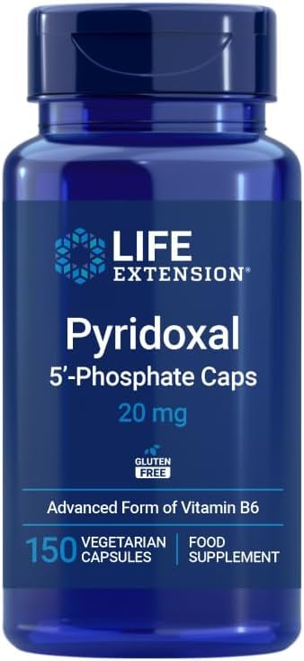 Reduces tiredness and fatigue: Vitamin B6 contributes to the reduction of tiredness and fatigue. Supports heart health: Contributes to the normal function of the cardiovascular system. Aids in glycogen metabolism: Contributes to the normal metabolism of protein and glycogen. Promotes energy metabolism: Important for normal energy metabolism. Supports the nervous system: Vitamin B6 contributes to the normal function of the nervous system.Réduit la fatigue et l'épuisement : La vitamine B6 contribue à la réduction de la fatigue et de l'épuisement. Soutient la santé cardiaque : Contribue au fonctionnement normal du système cardiovasculaire. Aide au métabolisme du glycogène : Contribue au métabolisme normal des protéines et du glycogène. Favorise le métabolisme énergétique : Important pour un métabolisme énergétique normal. Soutient le système nerveux : La vitamine B6 contribue au fonctionnement normal du système nerveux.Life Extension - Pyridoxal 5'-Phosphate 20 mg, 150 Gélules Végétariennes – Soutient le Système Nerveux, le Métabolisme Énergétique, le Métabolisme du Glycogène et la Santé Cardiaque