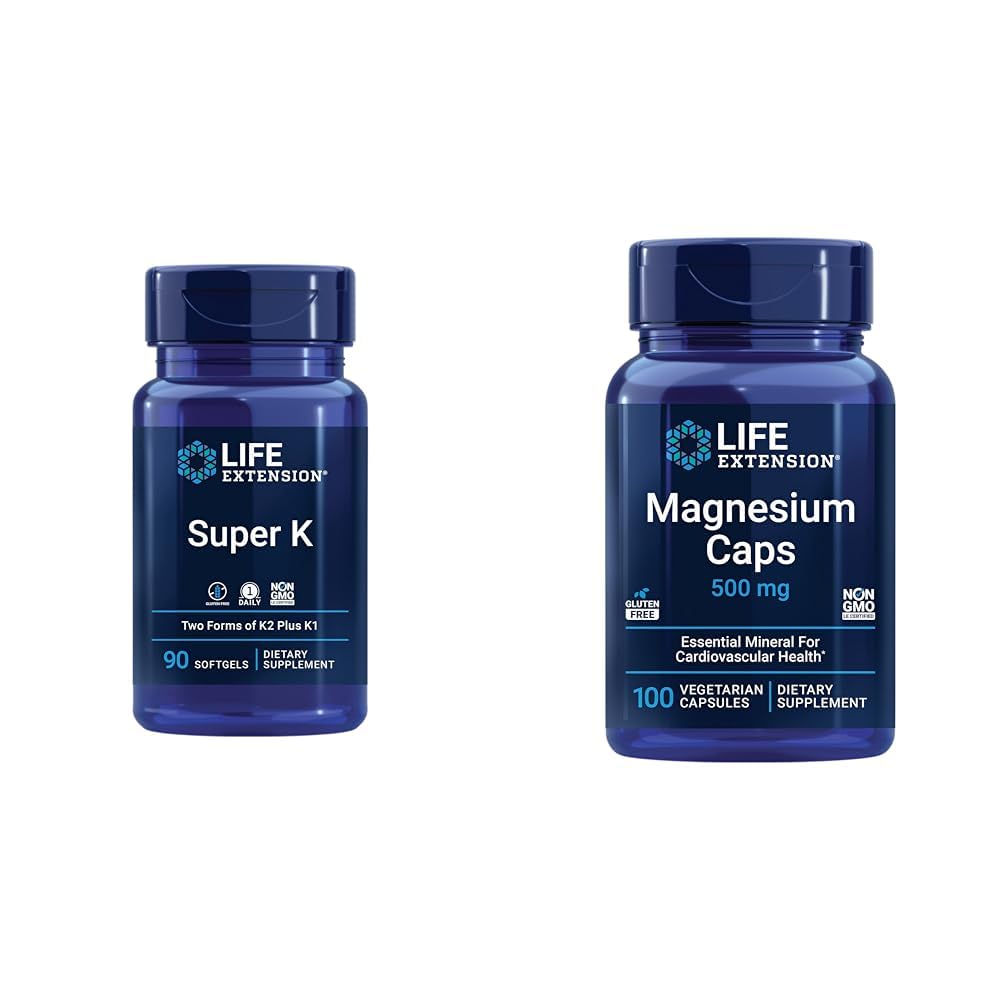 This bundle combines a potent vitamin K supplement with a magnesium complex to support your bone, heart, and overall health. The Super K component provides 2600 mcg of vitamin K from three sources - K1 along with two forms of K2 called MK-4 and MK-7 - to help maintain healthy bones and arteries. It's difficult to get enough vitamin K from foods alone, so this supplement ensures you get this essential nutrient. The magnesium capsule contains four types of magnesium, including oxide, citrate and succinate, to meet and exceed your daily magnesium needs with just one small pill. Magnesium relaxes blood vessels for healthy circulation, builds strong bones by working with calcium, and supports over 300 vital biological functions. Together, these two supplements fill key nutritional gaps, as many people do not get optimal vitamin K or magnesium from diet alone. The Super K provides both fast-absorbing and long-lasting K2, while the magnesium offers complete support with its triple complex. By combining the bone heart benefits of vitamin K with magnesium's whole-body effects, this bundle is designed to complement your health from all angles.