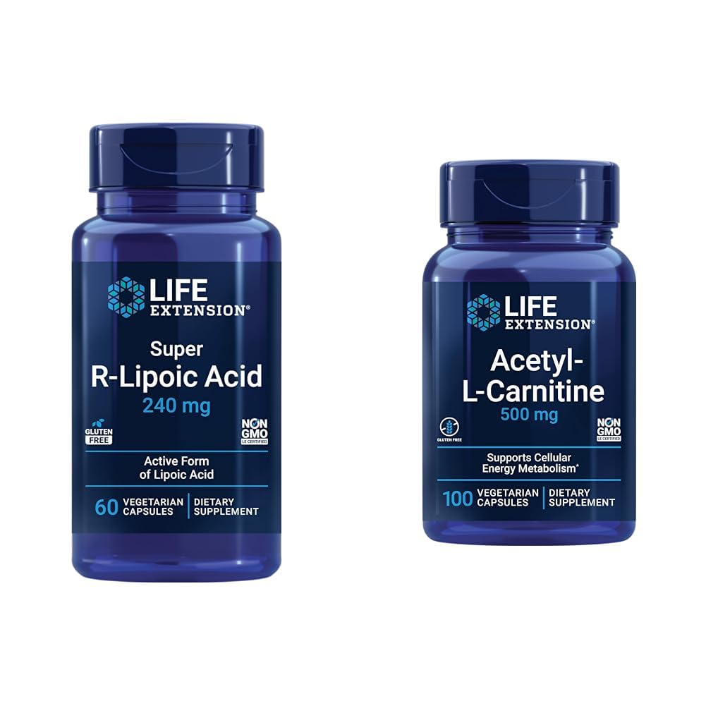 This bundle pairs two powerful cellular energy supplements to provide comprehensive support. The first component is Life Extension's Super R-Lipoic Acid, which contains 240mg of the superior "R" form of lipoic acid. This antioxidant protects mitochondria from oxidative damage, encouraging youthful energy production. It has remarkable bioavailability for rapid absorption and uptake. The second component is Acetyl-L-Carnitine with 100 capsules supplying 1500mg acetyl-L-carnitine and 200mg vitamin C per serving. Acetyl-L-carnitine is a modified form of L-carnitine that also supports cellular energy metabolism. It transports fatty acids into mitochondria where they are burned for energy while guarding against age-related oxidative stress. Acetyl-L-carnitine further crosses the blood-brain barrier to promote brain health. Together these two formulas provide multilayered defense of mitochondrial function and cellular energy pathways. The R-lipoic acid acts as a powerful antioxidant while both drive energy substrate utilization. This makes them ideal complements for whole-body wellness.