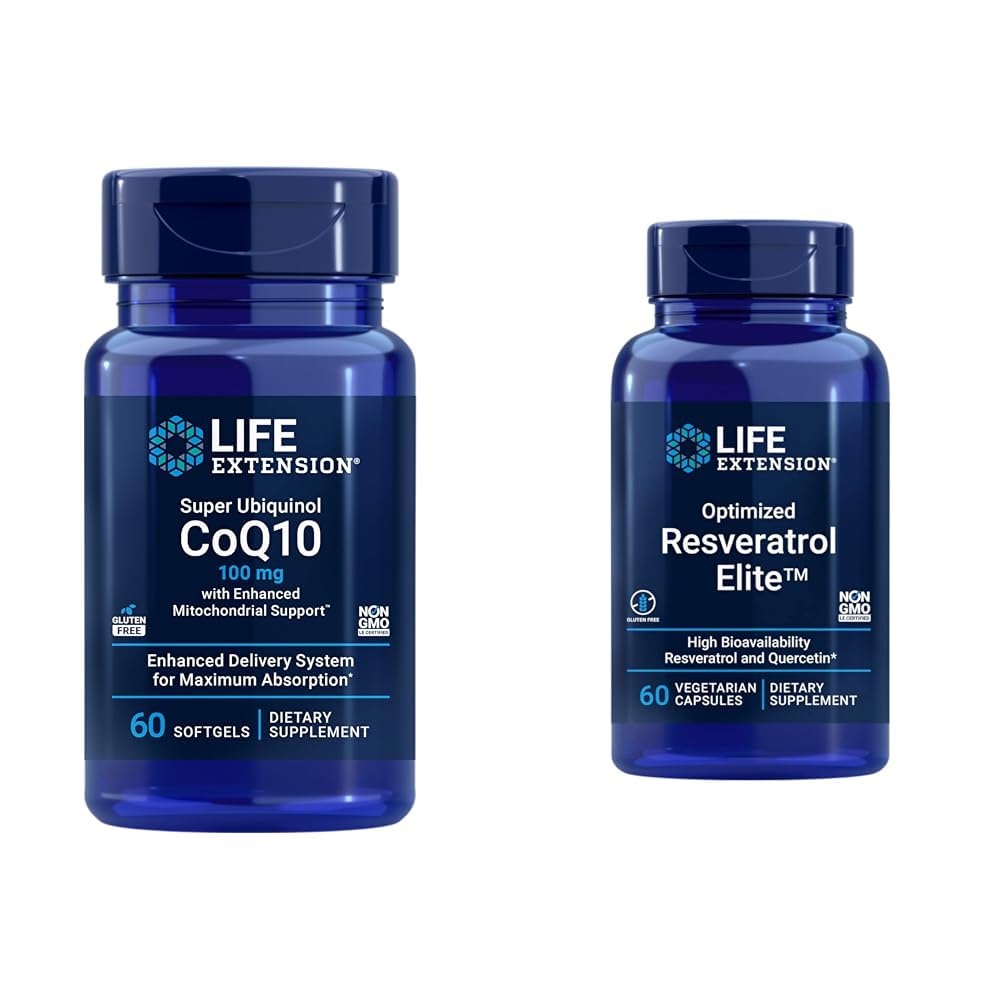 This bundle pairs two complementary supplements to support heart health, brain function, and cellular energy production. The first component contains 60 softgels of Life Extension Super Ubiquinol CoQ10 with shilajit. Ubiquinol is an absorbable form of CoQ10 that research shows the body absorbs up to 8 times more efficiently than ubiquinone CoQ10. Shilajit is an adaptogen added to enhance mitochondrial energy output. Together, these promote cardiovascular function, cognitive health, liver and kidney support, and youthful cellular energy levels. The second component has 60 vegetarian capsules of Life Extension Optimized Resveratrol Elite with added quercetin and fisetin. This formula pairs trans-resveratrol from Japanese knotweed with a hydrogel galactomannan fiber coating that increases resveratrol's bioavailability 10 times. The added quercetin and fisetin botanicals complement resveratrol's ability to inhibit oxidative stress and support a healthy inflammatory response. With one component energizing your cells and the other protecting them from age-related threats, this bundle offers a robust one-two approach to supporting whole-body wellness as you age.