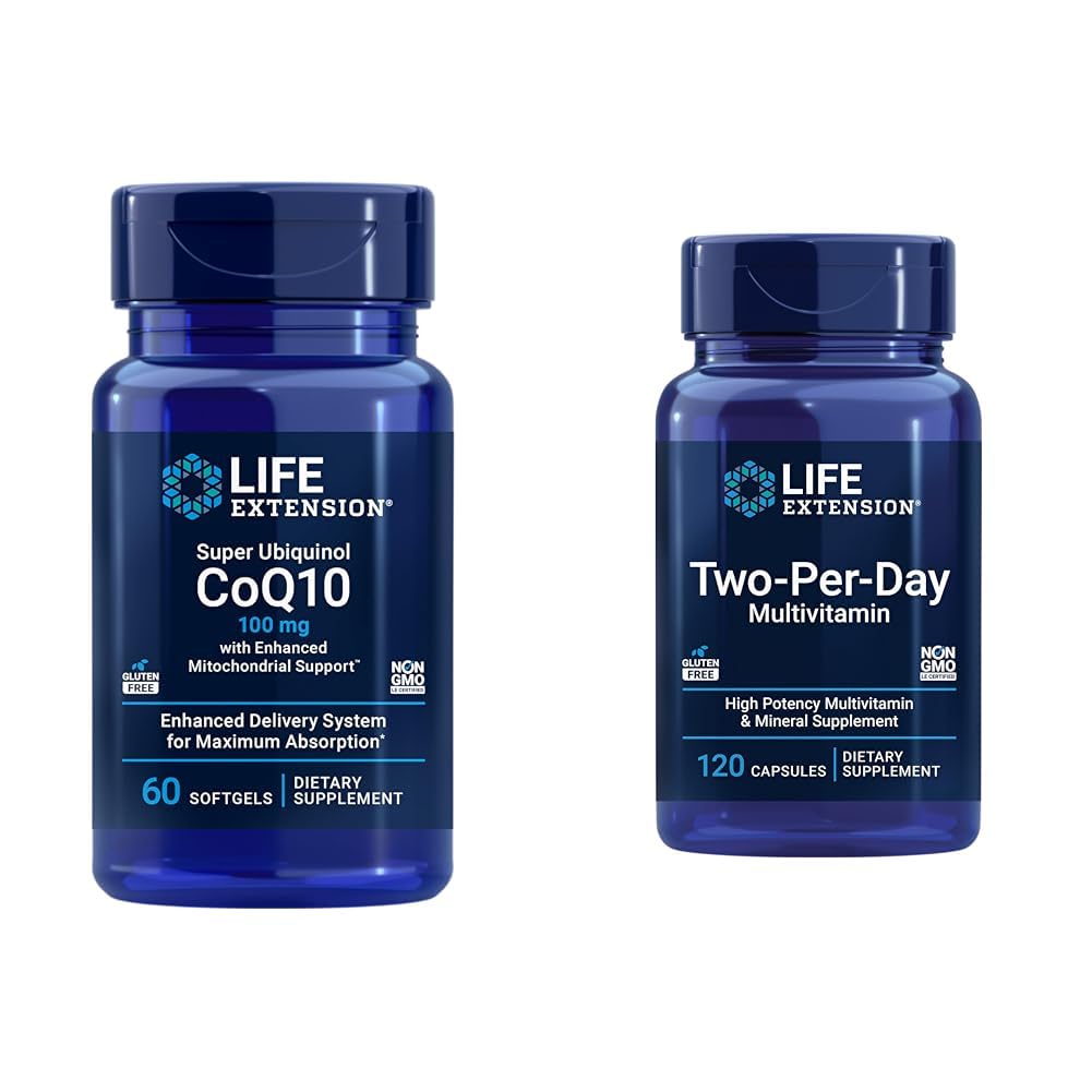 This bundle pairs Life Extension's Super Ubiquinol CoQ10 supplement with their Two-Per-Day Multivitamin to provide comprehensive nutritional support. The Super Ubiquinol CoQ10 is formulated with 60 softgels containing ubiquinol CoQ10 and shilajit. Ubiquinol is a highly bioavailable form of CoQ10 that research suggests absorbs up to 8 times better than the traditional ubiquinone form. CoQ10 plays an essential role in energy production and antioxidant protection. Shilajit is an adaptogen added to augment CoQ10's effects on cellular energy production. Together, these ingredients offer potent support for heart health, brain health, liver and kidney function. The Two-Per-Day Multivitamin packs 120 capsules with over 25 vitamins, minerals and beneficial plant extracts. It meets or exceeds the Recommended Daily Allowance for nearly all included nutrients. Key ingredients like vitamins C, D3, B complex and zinc promote immune health, healthy bones and energy production. Augmenting the CoQ10 with this comprehensive multivitamin provides complete nutritional support. With the Super Ubiquinol CoQ10 targeting cellular energy and the Two-Per-Day Multivitamin filling any nutritional gaps, these high-quality supplements perfectly complement each other for whole-body wellness.