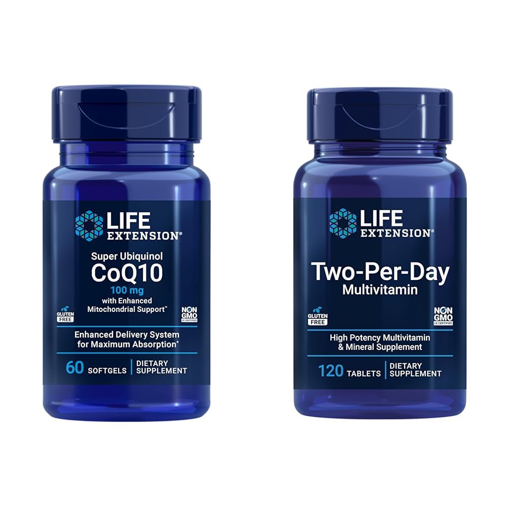 This powerful bundle combines two complementary supplements to support your health, energy levels, and wellbeing. The first component is Life Extension's Super Ubiquinol CoQ10 with 60 softgels containing a highly bioavailable form of CoQ10 called ubiquinol to promote heart health, cellular energy production, and youthful vitality. It also includes the adaptogen shilajit to further augment cellular energy by enhancing mitochondrial function. Together, these ingredients work synergistically to supercharge energy levels. The second component is the Life Extension Two-Per-Day High Potency Multi-Vitamin with 120 tablets. It includes over 25 vitamins, minerals and plant extracts that meet or exceed the Recommended Dietary Allowance (RDA) to support foundational wellness. Key ingredients like vitamins C, D3 and B vitamins, along with zinc, selenium and others, provide whole-body benefits - from immune health and healthy cell division to brain, nerve and heart health. With the CoQ10 softgels targeting energy production and the multi-vitamin tablets offering complete nutritional support, this bundle is the perfect one-two combination for full-spectrum health and vitality.