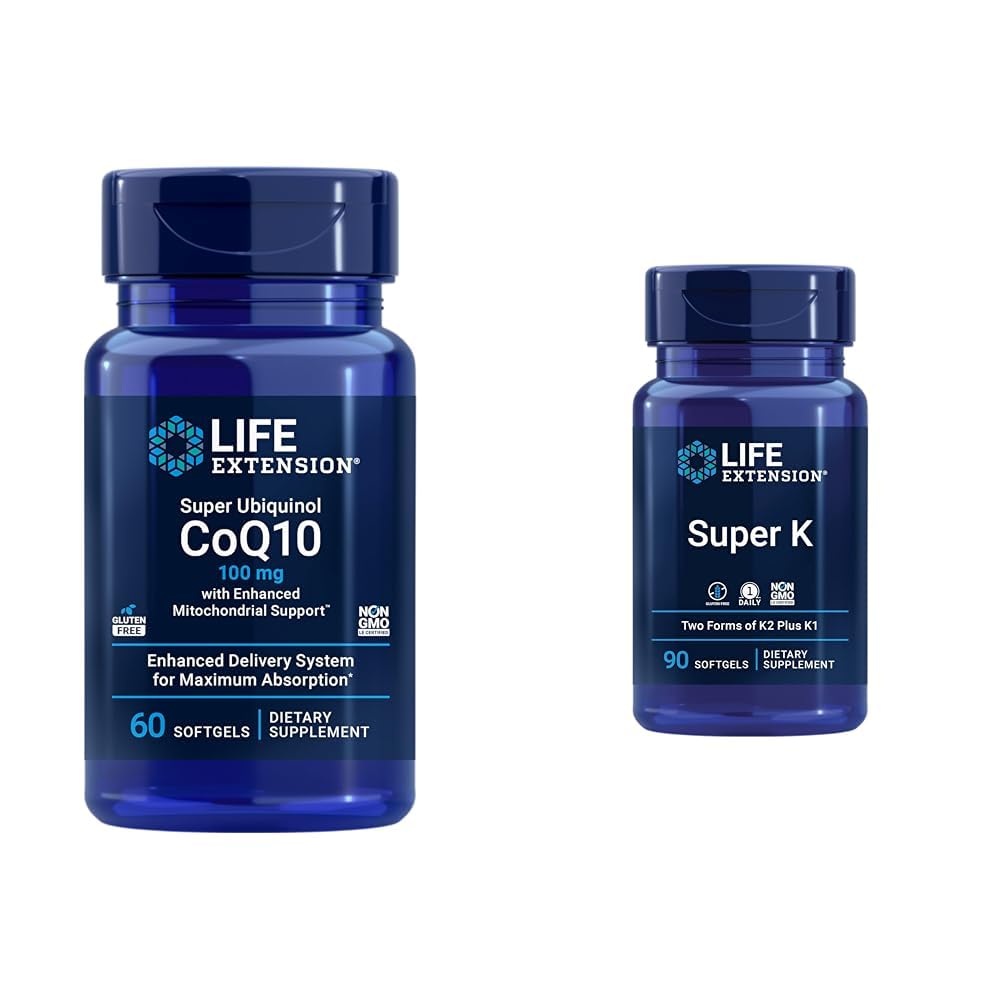 Life Extension Super Ubiquinol CoQ10 with Enhanced Mitochondrial Support, ubiquinol CoQ10, shilajit, potent heart health cellular energy production support, ultra-absorbable, gluten-free, 60 softgel CoQ10 is essential for cellular energy. It powers your heart, brain, and other high-energy organs. But the traditional form of CoQ10, ubiquinone, is difficult for the body to absorb. That's why we use ubiquinol, which has been shown to absorb up to 8 times greater than ubiquinone. Super Ubiquinol CoQ10 with Enhanced Mitochondrial Support is augmented with shilajit, an adaptogen that enhances mitochondrial energy production. The result is a powerful synergy that offers you the youthful cellular energy support you need. Life Extension Super K, vitamin K1, vitamin K2 mk-7, vitamin K2 mk-4, vitamin C, bone heart arterial health, 3-month supply, Gluten-Free, 1 Daily, Non-GMO, 90 softgels Vitamin K helps maintain your body's calcium balance, which affects everything from arterial health to healthy bone density. But it's hard to get sufficient vitamin K from food. So if you're trying to maintain bone or arterial health, a vitamin K supplement is a good idea. Super K provides THREE kinds of vitamin K to maximize its health benefits: vitamin K1 and two forms of K2, menaquinone-4 (MK-4) and menaquinone-7 (MK-7). Taking Super K every day is a good way to make sure you're getting enough of this essential nutrient for bone and vascular heath.Product 2: Ingredients matter—Sourced using only the finest raw ingredients with the purity and potency your body deserves. The majority of our products are non-GMO, gluten-free and manufactured in the USA—and a Certificate of Analysis is available for every product we produce. Product 2: Vitamin K, hold the cheese—Vitamin K2 is in meat, eggs and cheeses. Many people limit these foods for health reasons, which can make it hard to get enough. And there's more than one kind of K2 as well: this supplement has MK-4 and MK-7. MK-4 absorbs fast, while MK-7 stays active in your body much longer. Combining the two gives you the benefits of both. Product 2: Why you need a vitamin K supplement—Vitamin K1 is found in leafy green vegetables, but it's hard for your body to absorb this nutrient even if a spinach salad is your go-to lunch. Product 2: Strong bones, healthy heart—Vitamin K helps maintain your body's calcium balance, which affects everything from arterial health to bone density health. But it's hard to get sufficient vitamin K from food. This formula provides a potent dose of 2600 mcg of vitamin K from both K1 and two forms of K2. Product 1: Ingredients matter - Sourced using only the finest raw ingredients with the purity and potency your body deserves. The majority of our products are non-GMO, gluten-free and manufactured in the USA—and a Certificate of Analysis is available for every product we produce. Product 1: Essential for youthful energy - CoQ10 works at the cellular level to help your mitochondria convert sugar and fats into usable energy. Combining ubiquinol CoQ10 with shilajit—a nutrient discovered in the Himalayas—enhances mitochondrial energy production. Product 1: Energy for your brain, too - Your heart cells need CoQ10, but so do your other high-energy organs. In fact, CoQ10 is highly concentrated in your brain, liver and kidneys—but levels naturally deplete with time. Supplement to benefit from CoQ10's powerful antioxidant properties, which protect important proteins and mitochondrial DNA from oxidative stress. Product 1: Supercharge your heart health - CoQ10 supplements promote heart health and cellular energy production. Our formula includes a highly bioavailable ubiquinol form of coenzyme Q10. Plus, we've augmented it with the adaptogen shilajit to augment CoQ10's cellular energy benefits.