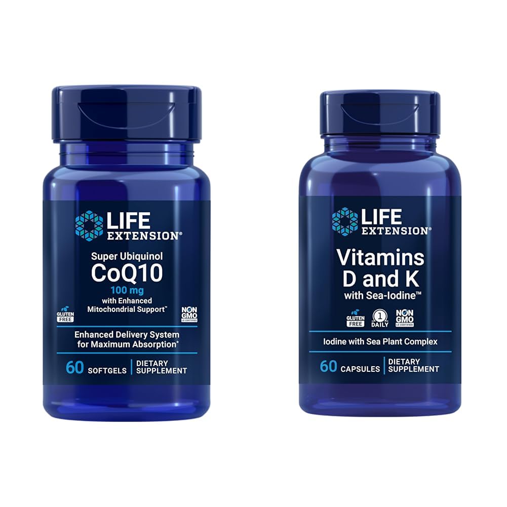 Life Extension Super Ubiquinol CoQ10 with Enhanced Mitochondrial Support, ubiquinol CoQ10, shilajit, potent heart health cellular energy production support, ultra-absorbable, gluten-free, 60 softgel CoQ10 is essential for cellular energy. It powers your heart, brain, and other high-energy organs. But the traditional form of CoQ10, ubiquinone, is difficult for the body to absorb. That's why we use ubiquinol, which has been shown to absorb up to 8 times greater than ubiquinone. Super Ubiquinol CoQ10 with Enhanced Mitochondrial Support is augmented with shilajit, an adaptogen that enhances mitochondrial energy production. The result is a powerful synergy that offers you the youthful cellular energy support you need. Life Extension Vitamins D and K with Sea-Iodine, vitamin D3, vitamin K1 and K2, iodine, supports immune, bone, arterial and thyroid health, non-GMO, gluten-free, 60 capsules An avalanche of favorable studies has resulted in record numbers of Americans supplementing with vitamin D. Since it is virtually impossible to obtain adequate vitamin D from food sources, supplementation with 5,000-8,000 IU daily is required by many aging individuals. Overlooked by almost everyone (except Life Extension members) is the critical importance of vitamin K. If one is concerned enough about their health to take higher dose vitamin D, it seems absurd to miss out on the benefits of vitamin K. For instance, vitamin D facilitates calcium absorption into the bloodstream and thus plays an important role in maintaining bone density. Less recognized is the need for vitamin K to transport calcium from the bloodstream into the bone. Vitamin K is also required by calcium-regulating proteins in the arteries. Together these two vitamins help maintain youthful calcium skeletal distribution while promoting vascular health.Product 2: Ingredients matter – We use only the finest raw ingredients with the purity and potency you deserve. The majority of our products are non-GMO, gluten-free and manufactured in the USA—and a Certificate of Analysis is available for every one. Product 2: Supports thyroid health—There's one more nutrient some people may lack: iodine. Common in table salt (and missing from many healthy diets), iodine is used to make thyroid hormones. Your thyroid helps regulate your body's metabolism. Product 2: Helps maintain strong bones—Vitamin D is necessary for bone health because, along with vitamin K, it gets calcium into your bones. Not only that, but we include multiple types of vitamin K in this formula: vitamin K1 as well as two types of vitamin K2. Product 2: Supports a healthy immune response—Are you getting enough vitamin D3? We've combined several nutrients diets often lack, like vitamin D, which helps maintain a balanced immune system along with other benefits, from bone health to cognitive function. Product 1: Ingredients matter - Sourced using only the finest raw ingredients with the purity and potency your body deserves. The majority of our products are non-GMO, gluten-free and manufactured in the USA—and a Certificate of Analysis is available for every product we produce. Product 1: Essential for youthful energy - CoQ10 works at the cellular level to help your mitochondria convert sugar and fats into usable energy. Combining ubiquinol CoQ10 with shilajit—a nutrient discovered in the Himalayas—enhances mitochondrial energy production. Product 1: Energy for your brain, too - Your heart cells need CoQ10, but so do your other high-energy organs. In fact, CoQ10 is highly concentrated in your brain, liver and kidneys—but levels naturally deplete with time. Supplement to benefit from CoQ10's powerful antioxidant properties, which protect important proteins and mitochondrial DNA from oxidative stress. Product 1: Supercharge your heart health - CoQ10 supplements promote heart health and cellular energy production. Our formula includes a highly bioavailable ubiquinol form of coenzyme Q10. Plus, we've augmented it with the adaptogen shilajit to augment CoQ10's cellular energy benefits.