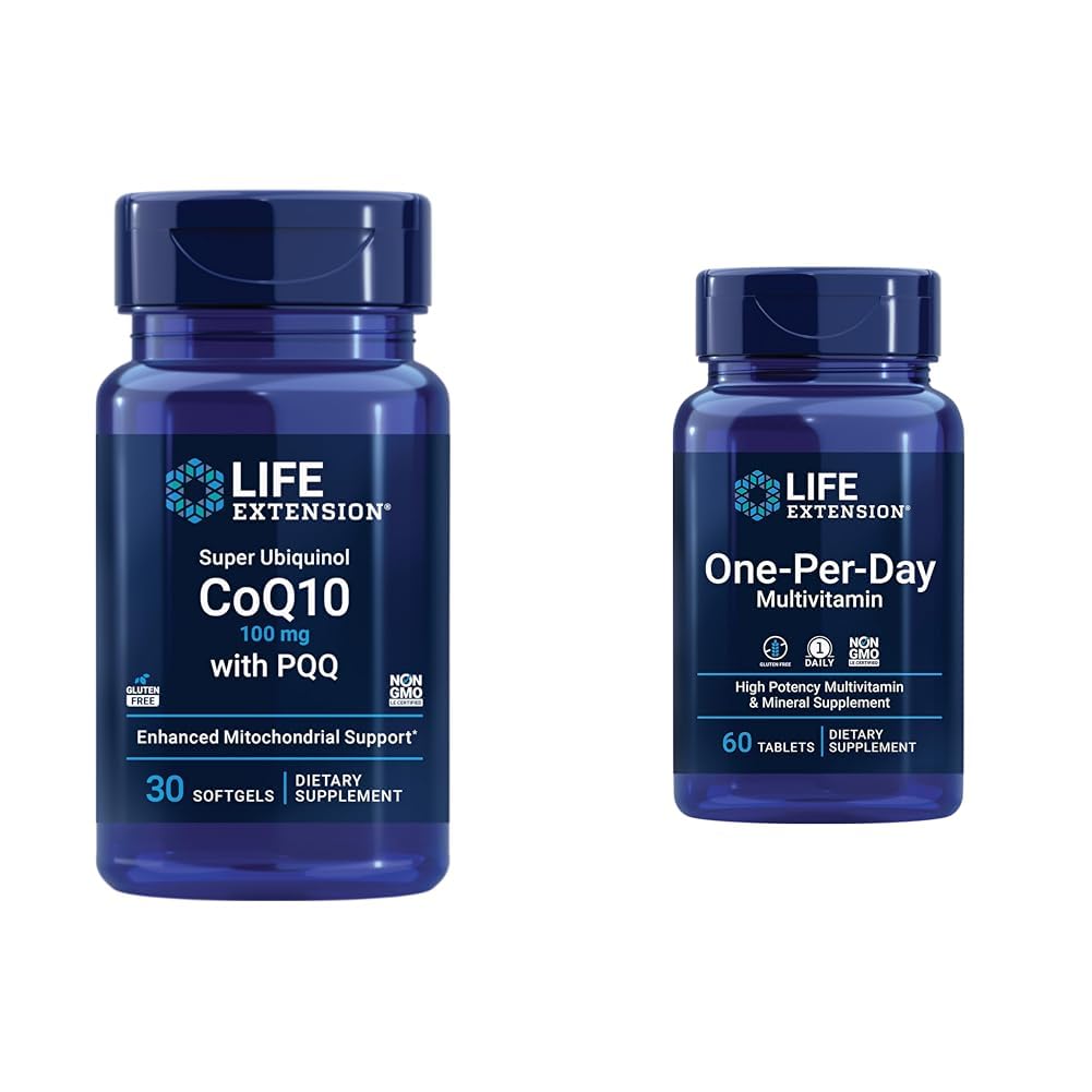 Life Extension Super Ubiquinol CoQ10 with PQQ, CoQ10, PQQ, shilajit, heart health, cellular energy support, 8x better absorption, gluten-free, 100 mg, 30 softgels Life Extension Super Ubiquinol CoQ10 with PQQ, 30 Softgels. Life Extension One-Per-Day Multivitamin – Packed with Over 25 Vitamins, Minerals Plant Extracts, Quercetin, 5-MTHF Folate More – 1-Daily, Non-GMO, Gluten-Free – 60 Tablets One-Per-Day Multivitamin makes it easy to get over 25 different vitamins, minerals and extracts, many of which meet or exceed RDAs. One-Per-Day has benefits for eye health, bone and heart health, healthy cell division, energy and immune health, already-healthy blood sugar, brain and nerve health, and even promotes a healthy inflammatory response, thanks to its comprehensive formula. This multivitamin formula includes vitamins A, B (including B6 and B12), E and K along with health must-haves vitamin C and vitamin D3, plus healthy minerals and extracts (including magnesium, zinc, selenium, inositol, apigenin, boron and more). This quality multivitamin is soy-free, gluten-free and non-GMO and contains more bioavailable, bioactive vitamin forms, like the B vitamin folate 5-MTHF, zinc citrate, the mixed tocopherol form of vitamin E and more. Get the most out of your multivitamin with Life Extension One-Per-Day tablets.Product 2: Ingredients matter – We use only the finest raw ingredients with the purity and potency you deserve. The majority of our products are non-GMO, gluten-free and manufactured in the USA—and a Certificate of Analysis is available for every one. Product 2: "B" all that you can be with vitamin B – There's more than one vitamin B. One-Per-Day contains readily metabolized forms of vitamin B1 and B2, as well as vitamin B6 and vitamin B12. Product 2: Supports immune health with vitamins C and D – Vitamin C is associated with immune system health. Vitamin D3 supports immune system health, bone health and more. Product 2: Meets and exceeds recommended daily allowance – Our One-Per-Day Multivitamin meets or exceeds the Recommended Dietary Allowance (RDA) for biotin, vitamin A through vitamin E, and even iodine, thiamine and selenium. Product 1: Ingredients matter—Sourced using only the finest raw ingredients with the purity and potency your body deserves. The majority of our products are non-GMO, gluten-free and manufactured in the USA—and a Certificate of Analysis is available for every product we produce. Product 1: Easy-to-absorb ubiquinol—Traditional CoQ10 is not easy for the body to absorb. That's why we use a patented delivery system with a form of CoQ10 called ubiquinol, making it up to 8x more available than standard CoQ10. We also added shilajit, a nutrient native to the Himalayas that's been shown to enhance CoQ10's effectiveness. Product 1: Promote new mitochondria—We combined energy-supporting CoQ10 with pyrroloquinoline quinone, PQQ for short. PQQ is a nutrient that supports production of new mitochondria by activating genes involved in the formation of fresh mitochondria and mitochondrial health. Plus, CoQ10 and PQQ are powerful antioxidants that help protect cells against free radicals. Product 1: More energy at the cellular level—Coenzyme Q10 (CoQ10) is an essential nutrient your body needs to maintain mitochondrial function, the tiny powerpacks in your cells that produce energy. It's concentrated in workhorse organs like your heart, brain, liver and kidneys.