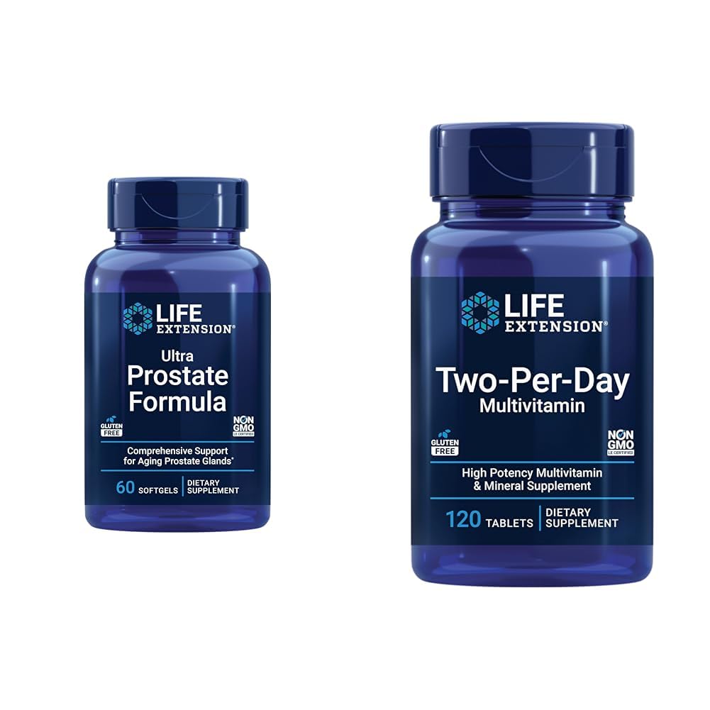 Life Extension Ultra Prostate Formula, saw palmetto for men, pygeum, stinging nettle root, lycopene, 11 nutrients for prostate function, non-GMO, gluten-free, 60 softgels As a man ages, maintaining a healthy prostate is key. This next-generation prostate health formula contains a broad array of ingredients to promote healthy prostate function and support normal urine flow. Botanical extracts like saw palmetto, nettle root, lycopene and more make Ultra Natural Prostate the most comprehensive prostate health supplement anywhere. Life Extension Two-Per-Day High Potency Multi-Vitamin Mineral Supplement - Vitamins, Minerals, Plant Extracts, Quercetin, 5-MTHF Folate More - Gluten-Free - Non-GMO - 120 Tablets Staying healthy is a daily effort. But it doesn't have to be difficult. Two-Per-Day Multivitamin makes it easy. It is a customer-favorite wellness formula that helps you cover all your bases. Including over 25 different vitamins, minerals and extracts and meeting or exceeding RDAs anywhere one exists, Two-Per-Day has your back. From more common vitamins (including the B vitamins like vitamin B6 and vitamin B12) along with health favorites vitamin C and vitamin D3, to healthy minerals and extracts (including zinc, selenium, inositol, apigenin, boron and more), our Two-Per-Day daily multivitamin is a comprehensive formula that supports a healthy foundation with quality ingredients that help you cover every health need. With benefits for eye health, bone and heart health, healthy cell division, energy and immune health, already-healthy blood sugar, brain and nerve health, and even promoting a healthy inflammatory response, supplementing with Two-Per-Day is a no-brainer!Product 2: Live your healthiest life—For over 40 years, we've been developing advanced, effective formulas made with the highest standards and based on the latest scientific findings. We believe the answers to a healthier, richer life are within reach, and that rigorous scientific research is the path to get us there. That's why so many of our nutritional formulas are designed using specific ingredients and amounts based on scientific studies. Product 2: Ingredients matter—Sourced using only the finest raw ingredients with the purity and potency your body deserves. The majority of our products are non-GMO, gluten-free and manufactured in the USA—and a Certificate of Analysis is available for every product we produce. Product 2: Support immune health with vitamins C D—Vitamin C is associated with immune system health, which may be due to its ability to scavenge free radicals and protect against oxidative stress, as well as its stimulation of the production and function of white blood cells. Vitamin D3 supports immune system health, bone health and more. Product 2: Meets exceeds recommended daily allowance —In order to support optimal health and well-being, you need a science-based dose of vitamins and minerals every day. Our Two-Per-Day Multivitamin meets or exceeds the Recommended Dietary Allowance (RDA) for nearly every ingredient where an RDA exists, for both common and hard to get nutrients, like biotin, vitamin A through vitamin E, and even iodine, thiamine and selenium. Product 1: Ingredients matter—Sourced using only the finest raw ingredients with the purity and potency your body deserves. The majority of our products are non-GMO, gluten-free and manufactured in the USA—and a Certificate of Analysis is available for every product we produce. Product 1: Our best prostate supplement—Ultra Prostate Formula includes additional ingredients for prostate support. This includes an ultra-absorbable Boswellia extract that helps support a healthy inflammatory response. Potent botanicals, including nettle root, also help promote healthy prostate hormone metabolism. And phospholipids help you absorb the other active compounds in this formula. Product 1: The power of beta-sitosterol—Beta-sitosterol has been studied to help promote healthy urine flow and bladder support, prostate function and more. So we've included several complementary ingredients known to contain this beneficial bioactive compound, including saw palmetto extract, an extract of the African cherry tree called pygeum, and extracts of pine and pumpkin seed oil. Product 1: Comprehensive prostate support formula—It's essential for men to maintain prostate health as they age. Ultra Prostate Formula has been specifically designed to address multiple factors necessary for lasting prostate health. By combining complementary ingredients that support prostate health and healthy urination patterns, this prostate supplement for men helps maintain hormone balance, promotes a healthy inflammatory response and more.