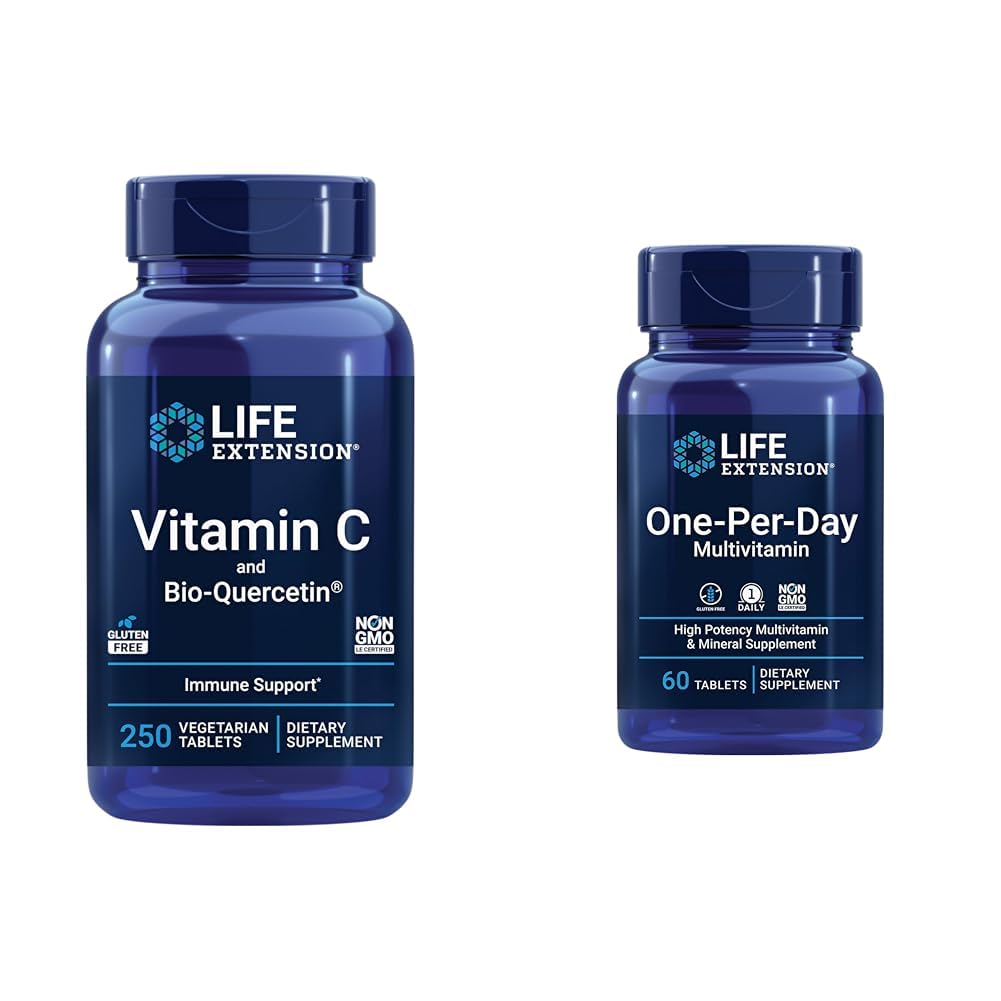 This bundle combines antioxidant and immune support from Life Extension Vitamin C Bio-Quercetin Phytosome with comprehensive daily nutrition from Life Extension One-Per-Day Multivitamin. The Vitamin C Bio-Quercetin Phytosome provides 1000mg of vitamin C plus 50 times more bioavailable quercetin to fight oxidative stress and support healthy immune function. Quercetin is wrapped in a phytosome for enhanced absorption compared to traditional quercetin. Together, the vitamin C and quercetin promote overall health. The One-Per-Day Multivitamin delivers over 25 vitamins, minerals and plant extracts, meeting or exceeding the recommended daily intake for many nutrients like vitamins A-E, selenium, and more. It includes immune-supporting vitamins C and D3, energy and brain-supporting B vitamins, plus additional health-promoting nutrients and extracts like zinc, magnesium, and apigenin. With rigorous scientific research guiding both formulations, this bundle offers antioxidant protection, immune health support, increased energy, and comprehensive daily nutrition in one convenient package.