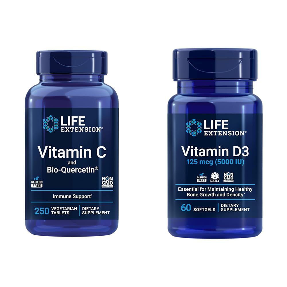 This bundle combines two complementary supplements from Life Extension to support overall health - vitamin C with bioavailable quercetin, and vitamin D3. The vitamin C with phytosome-wrapped quercetin provides 1000mg vitamin C plus antioxidant and immune-boosting quercetin that is 50 times more bioavailable than traditional forms. Together, these promote immune health, healthy inflammatory response, and protect against oxidative damage. The vitamin D3 provides 125mcg (5000IU) to support bone health, brain performance, immune function, and already-healthy blood pressure. Clinical trials confirm the importance of optimal vitamin D levels for health. With antioxidant and immune support from the vitamin C and quercetin, plus broad-spectrum health benefits from the high-potency vitamin D3, this bundle offers a multifaceted approach to daily nutrition for wellness.
