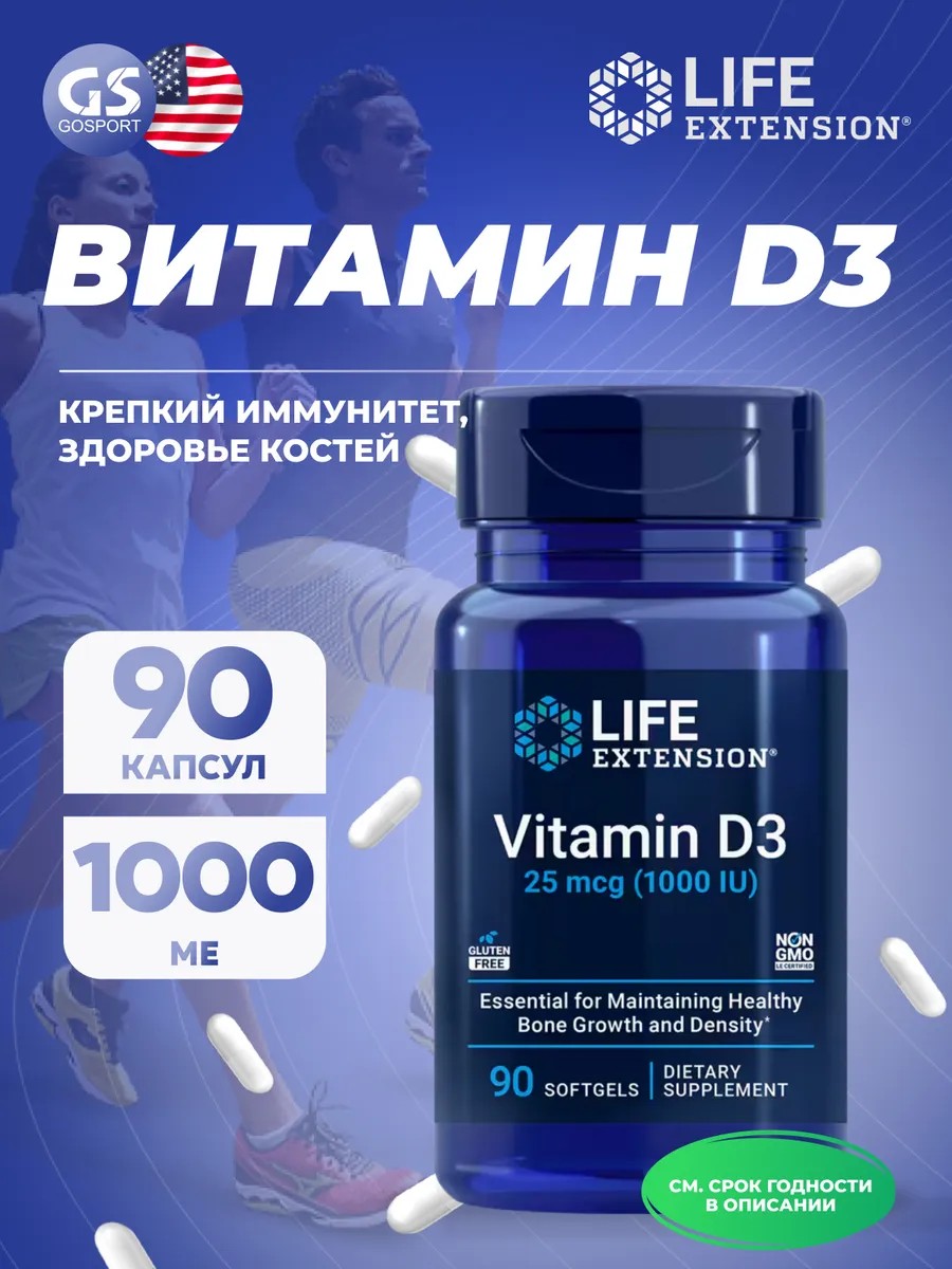 Expires until February 28, 2026. Vitamin D Vitamin D3 25 mcg (1000 IU) 90 capsules. Life Extension Vitamin D3 25 mcg (1000 IU) is a dietary supplement containing vitamin D3 (as cholecalciferol), which plays an important role in maintaining healthy bones, teeth, and joints. Vitamin D3 promotes calcium synthesis, making it especially beneficial for maintaining strong bones, teeth, and joints. Take care of your health and the health of your loved ones! Vitamin D3 also supports the immune system, strengthening the immune system and increasing resistance to stress and disease. Regular intake of this dietary supplement helps improve cardiovascular function and maintain optimal calcium levels in the blood, which is necessary for normal heart muscle function. Athletes and those who enjoy an active lifestyle will appreciate the benefits of vitamin D3 when building muscle mass—it helps improve endurance and performance, and promotes faster recovery after exercise. Vitamin D3 supports metabolism and aids weight loss by effectively combating unwanted fat deposits. This supplement is beneficial for both men and women. It supports healthy skin, nails, and hair, promoting their beauty and strength. Vitamin D3 also impacts nervous system function and helps maintain good memory and mood, which is especially important during times of stress. By adding Life Extension Vitamin D3 to your diet, you'll provide your body with the vitamin it needs to maintain an active lifestyle, balance, and energy. Don't miss out on the opportunity to care for your health and the health of your loved ones. Directions: Take one (1) capsule daily with food, or as directed by a healthcare practitioner.