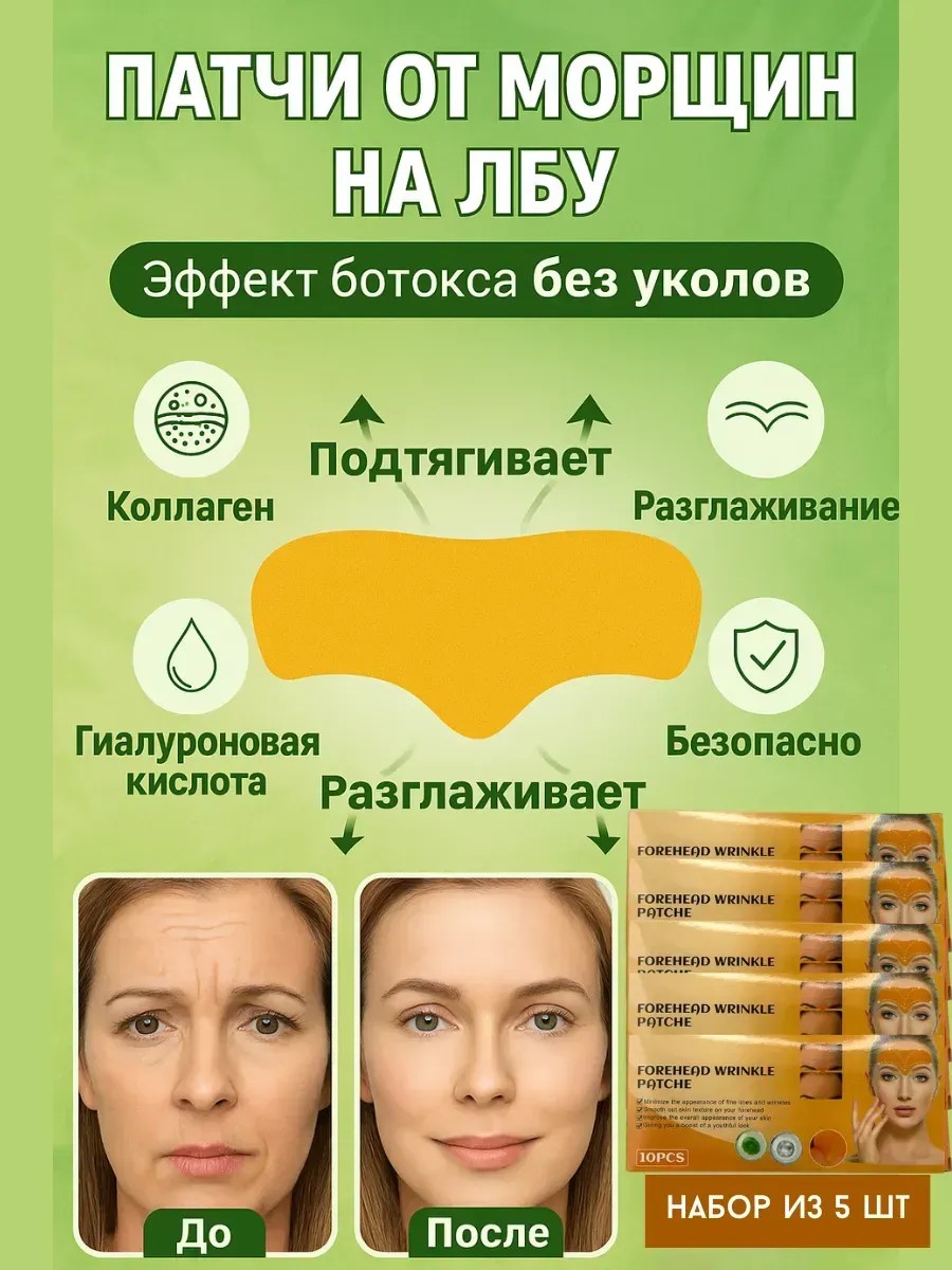 | Комплектация | Антивозрастные патчи для лба от морщин и заломов кожи 5 пачек |