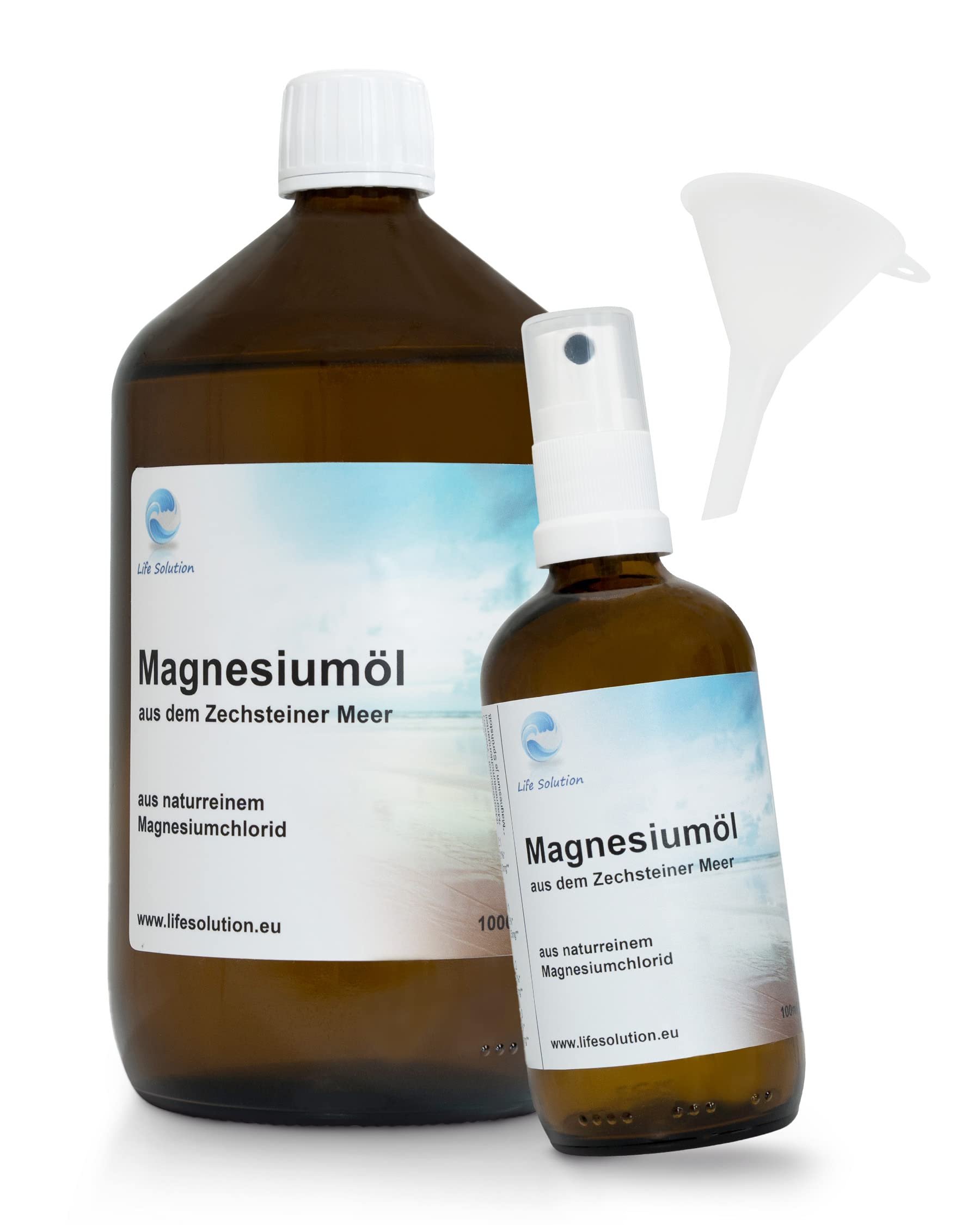 Life Solution - Zechstein Magnesiumöl - Pures Magnesium-Öl Spray - Massageöl - Muskelentspannungsöl - Zechstein Öl mit Sprühflasche Trichter - 1000ml