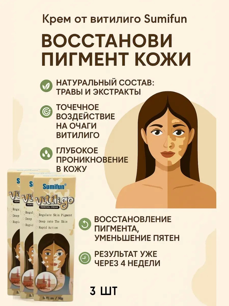 | Комплектация | Натуральный крем от белых пятен на коже витилиго Sumifun 3 шт |