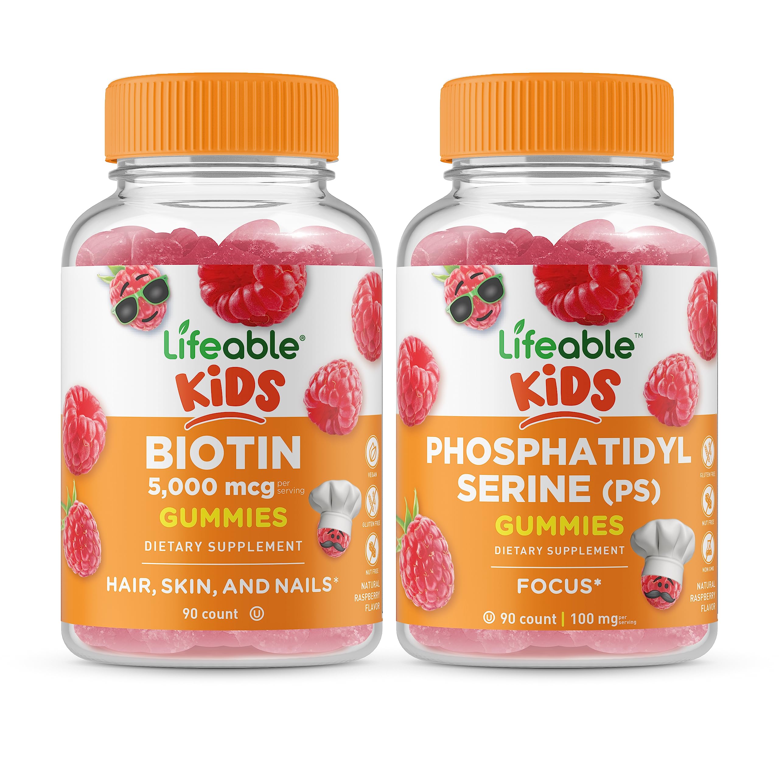 Lifeable Biotin Kids + Phosphatidylserine (PS) Kids Gummies Bundle - Great Tasting Vitamin Supplement Gluten Free GMO Free Chewable Gummy