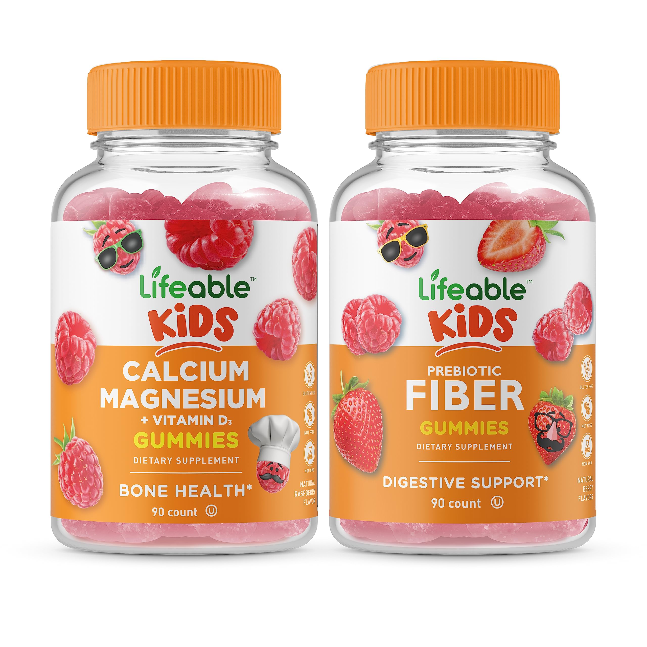 GREAT TASTING GUMMIES: These gummies have great flavors everyone loves they are pleasant and easy to chew you'll find yourself reaching for more. NATURAL FLAVORED AND NON-GMO: These naturally sourced gummies by Lifeable are certified non-GMO, gluten-free, dairy-free, and free of peanuts. Kosher and Halal. LIFEABLE PREBIOTIC FIBER KIDS CONTAINS 90 GUMMIES: Each serving consists of 2 jellies, which have a total of 5 g of Fiber. This bottle contains 90 gummies, equaling 45 servings. 2 gummies per day is recommended for kids age 2 . These vitamins are suitable for adults, too. LIFEABLE CALCIUM MAGNESIUM KIDS CONTAINS 30 SERVINGS PER BOTTLE: These high potency calcium magnesium gummies are 3 gummies per serving. This bottle contains 90 gummies equaling 30 servings.