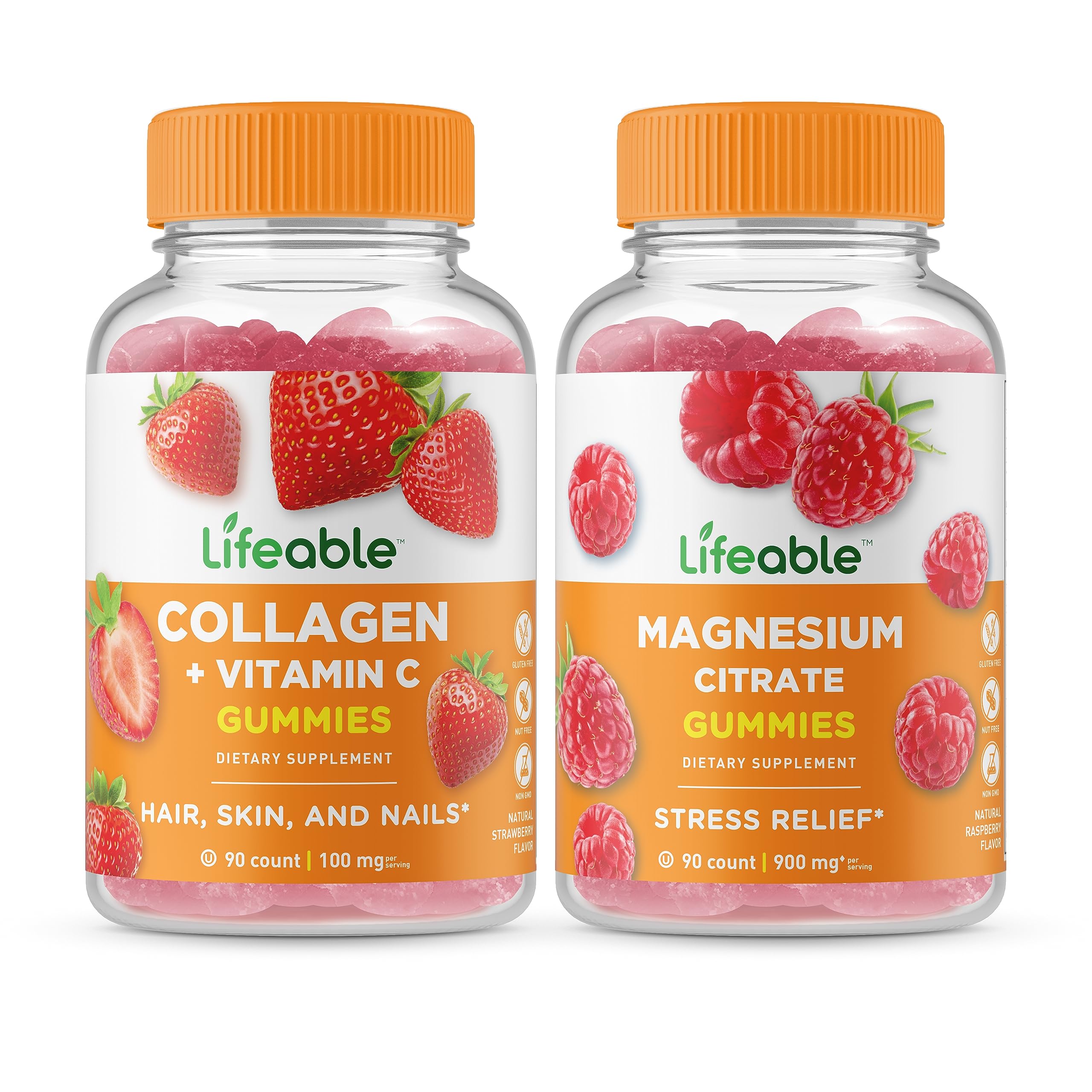 DOCTOR RECOMMENDED: Lifeable spends thousands of hours on research, testing, and analyzing each of our products. Our entire line of supplements is backed with the approval of a renowned family doctor. GREAT TASTING GUMMIES: These gummies have great flavors everyone loves they are pleasant and easy to chew you'll find yourself reaching for more. NATURAL FLAVORED AND NON-GMO: These naturally sourced gummies by Lifeable are certified non-GMO, gluten-free, dairy-free, and free of peanuts. Kosher and Halal. LIFEABLE MAGNESIUM CONTAINS 900 MG PER SERVING: Each serving is 3 jellies, with a total 900 mg of magnesium citrate. Adults should take 3 gummies per day. The bottle contains 90 pieces for 30 servings also suitable for kids age 2 . LIFEABLE COLLAGEN VITAMIN C CONTAINS 100 MG PER SERVING: Each serving contains 100 mg of the all-important protein, collagen peptides and 30 mg vitamin c. This bottle contains 90 gummies, with two gummies per serving, equaling 45 servings.