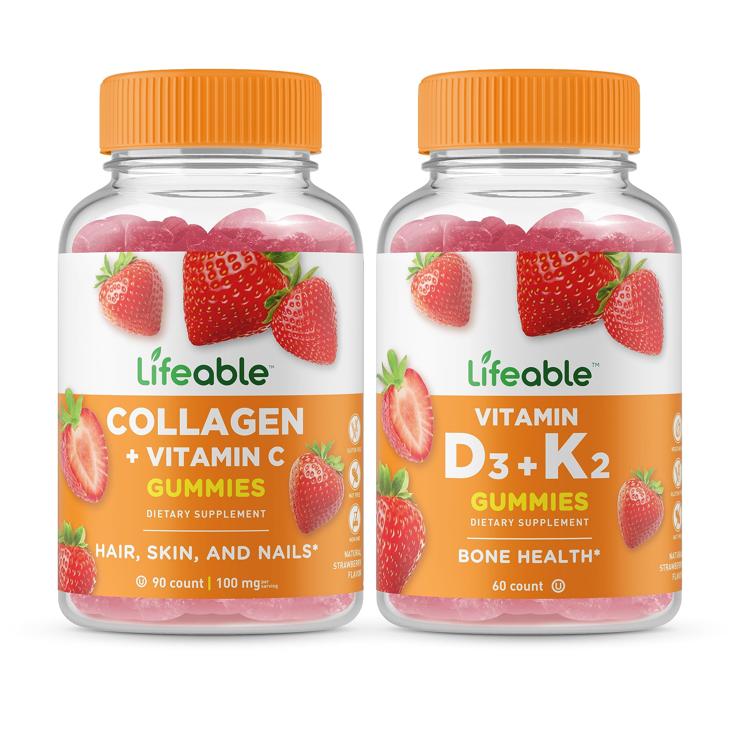 DOCTOR RECOMMENDED: Lifeable spends thousands of hours on research, testing, and analyzing each of our products. Our entire line of supplements is backed with the approval of a renowned family doctor. GREAT TASTING GUMMIES: These gummies have great flavors everyone loves they are pleasant and easy to chew you'll find yourself reaching for more. NATURAL FLAVORED AND NON-GMO: These naturally sourced gummies by Lifeable are certified non-GMO, gluten-free, dairy-free, and free of peanuts. Kosher and Halal. LIFEABLE VITAMIN D3 VITAMIN K2 CONTAINS VITAMIN D 1000 IU VITAMIN K 100 mcg: Each serving contains 1000 IU - 25 mcg vitamin D-3 and 100 mcg vitamin K-2 MK7. This bottle contains 60 gummies, with 2 gummies per serving, equaling 30 servings. These vitamins are suitable for kids age 2 , too. LIFEABLE COLLAGEN VITAMIN C CONTAINS 100 MG PER SERVING: Each serving contains 100 mg of the all-important protein, collagen peptides and 30 mg vitamin c. This bottle contains 90 gummies, with two gummies per serving, equaling 45 servings.