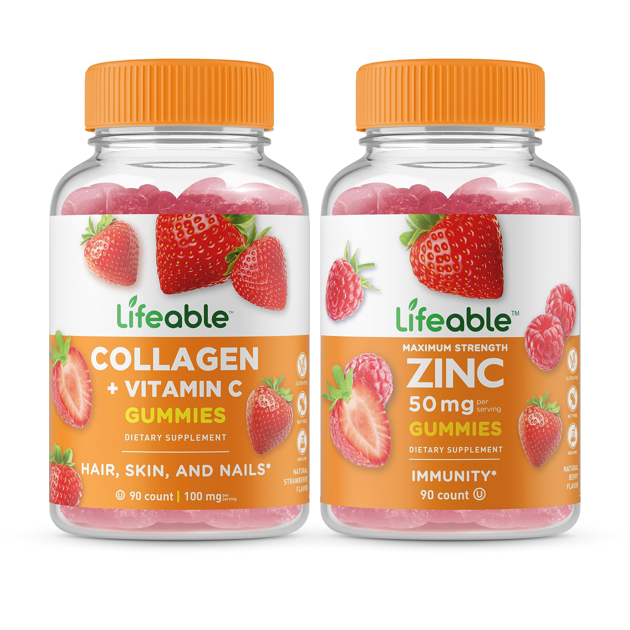 Lifeable Collagen & Vitamin C + Zinc 50mg Gummies Bundle - Great Tasting Vitamin Supplement Gluten Free GMO Free Chewable Gummy