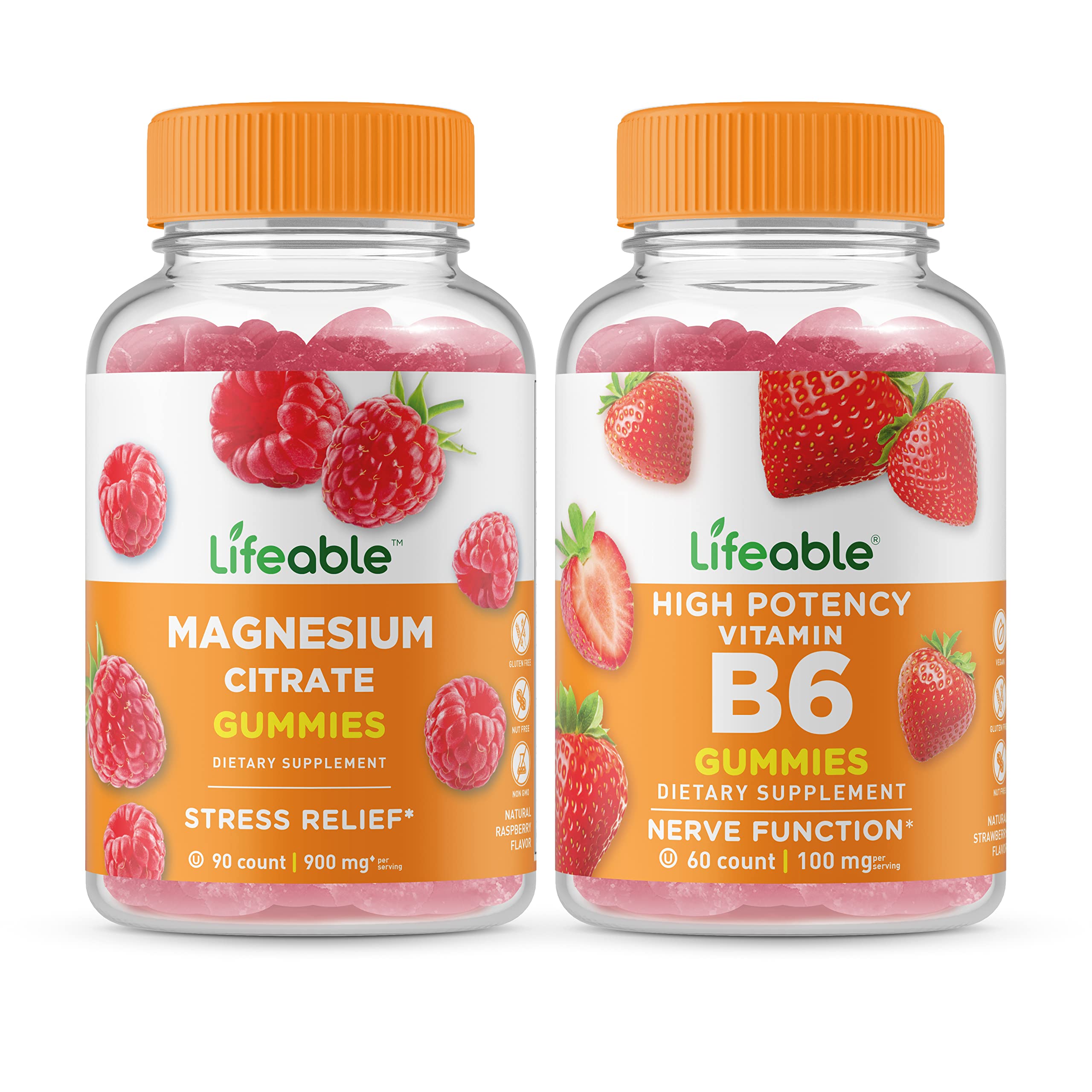 DOCTOR RECOMMENDED: Lifeable spends thousands of hours on research, testing, and analyzing each of our products. Our entire line of supplements is backed with the approval of a renowned family doctor. GREAT TASTING GUMMIES: These gummies have great flavors everyone loves they are pleasant and easy to chew you'll find yourself reaching for more. NATURAL FLAVORED AND VEGAN: These Vegan gummies by Lifeable are certified non-GMO, gluten-free, dairy-free, and free of peanuts. Kosher and Halal. LIFEABLE VITAMIN B6 CONTAINS 100mg PER SERVING: Each serving consists of 2 jellies with a total of 100 mg of B6 vitamin (as Pyridoxine Hydrochloride). This bottle contains 60 gummies, equaling 30 servings. Adults are recommended to take 2 gummies per day. These vitamins are suitable for kids age 2 , too. LIFEABLE MAGNESIUM CONTAINS 900 MG PER SERVING: Each serving is 3 jellies, with a total 900 mg of magnesium citrate. Adults should take 3 gummies per day. The bottle contains 90 pieces for 30 servings also suitable for kids age 2 .