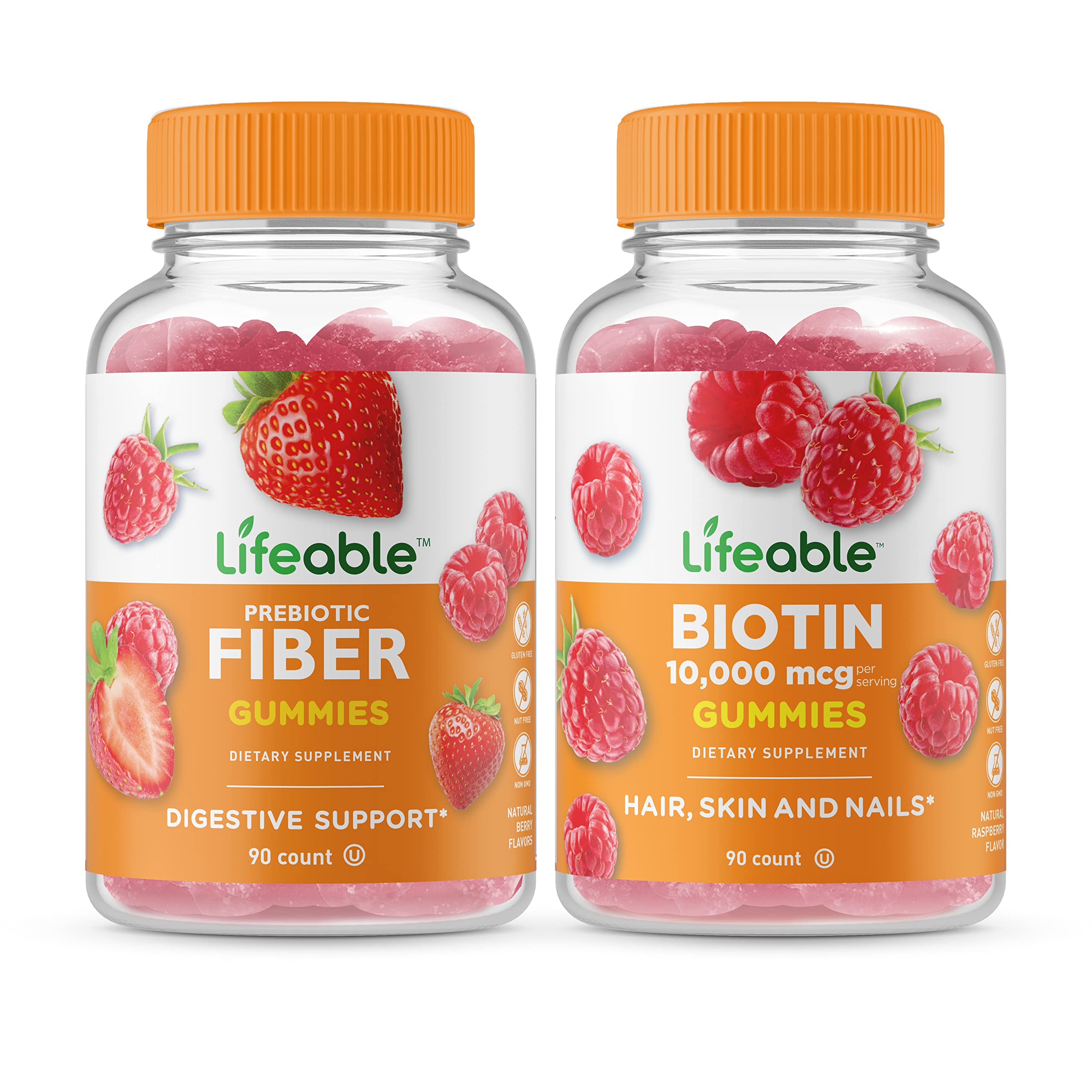 Lifeable Prebiotic Fiber 5g + Biotin Gummies Bundle - Great Tasting Vitamin Supplement Gluten Free GMO Free Chewable Gummy