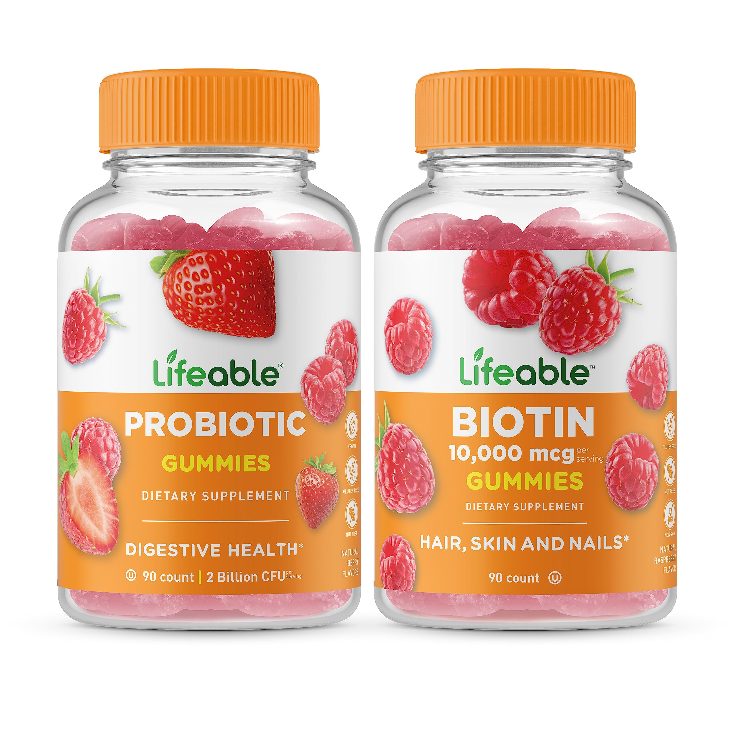 Lifeable Probiotic 2 Billion CFU + Biotin Gummies Bundle - Great Tasting Vitamin Supplement Gluten Free GMO Free Chewable Gummy