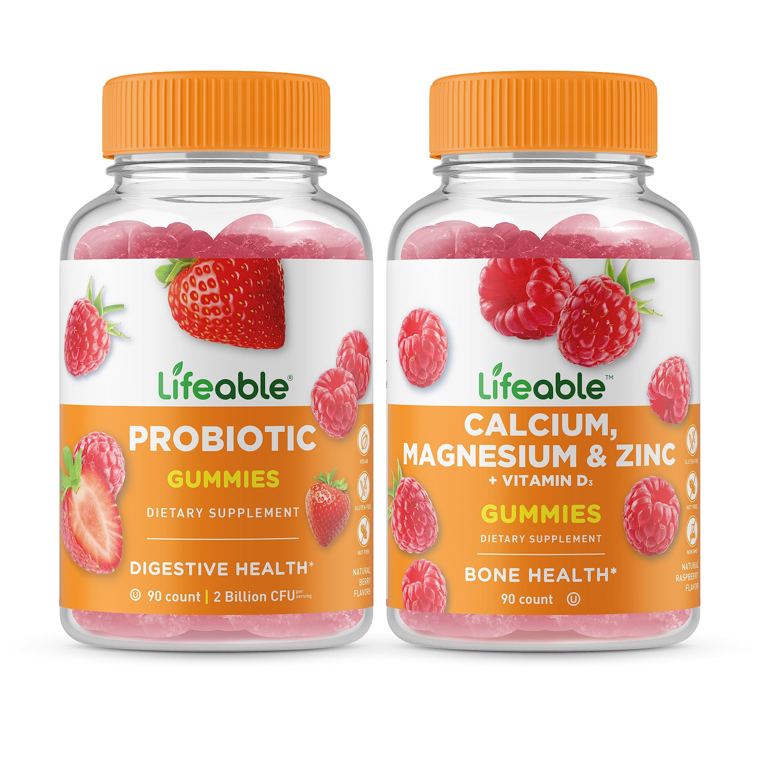 Lifeable Probiotic 2 Billion CFU + Calcium Magnesium Zinc & Vitamin D Gummies Bundle - Great Tasting Vitamin Supplement Gluten Free GMO Free Chewable Gummy