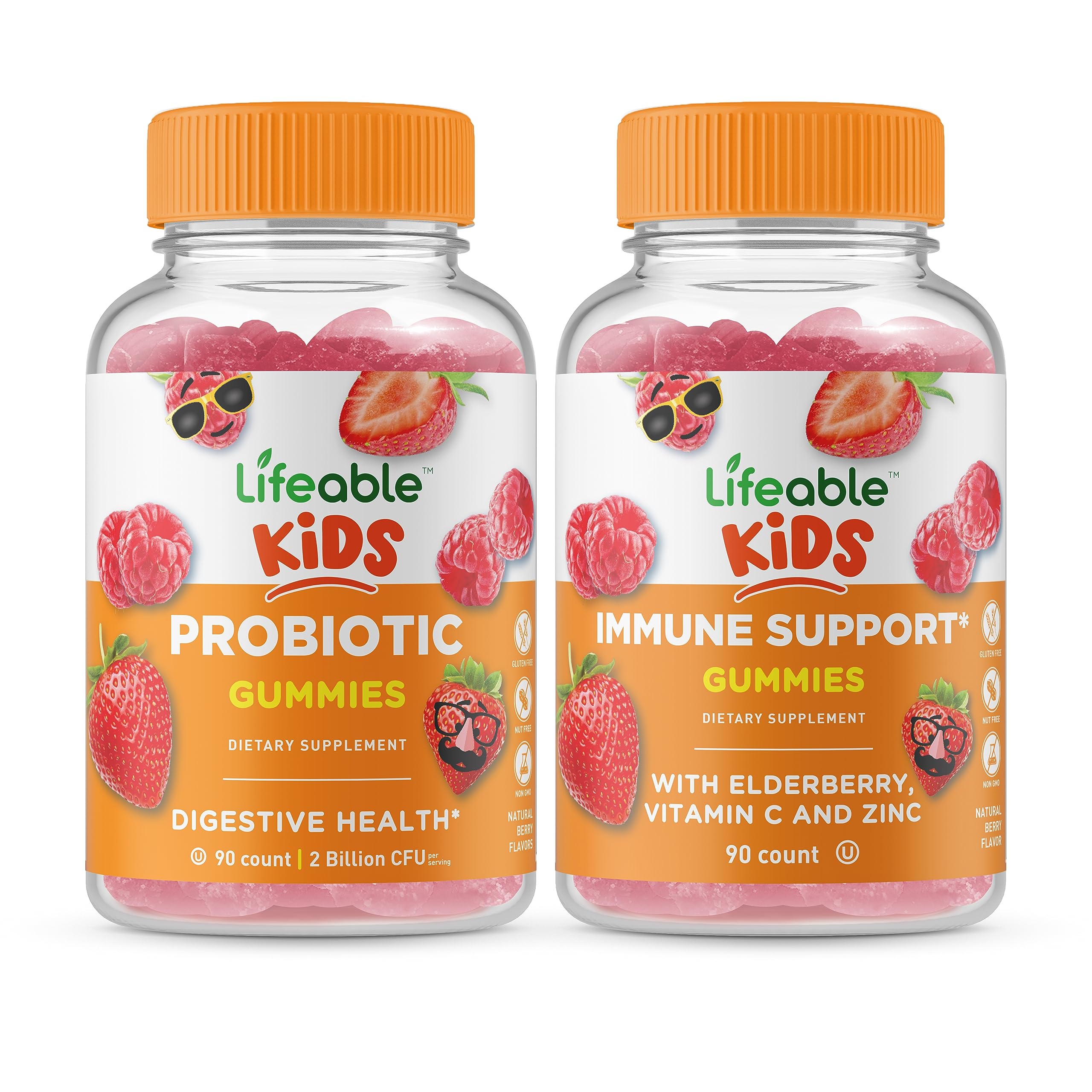 DOCTOR RECOMMENDED: Lifeable spends thousands of hours on research, testing, and analyzing each of our products. Our entire line of supplements is backed with the approval of a renowned family doctor. GREAT TASTING GUMMIES: These gummies have great flavors everyone loves they are pleasant and easy to chew you'll find yourself reaching for more. NATURAL FLAVORED AND VEGAN: These Vegan gummies by Lifeable are certified non-GMO, gluten-free, dairy-free, and free of peanuts. Kosher and Halal. LIFEABLE IMMUNE SUPPORT KIDS CONTAINS 45 SERVINGS PER BOTTLE: Each serving consists of 100 mg elderberry, 90 mg vitamin c, and 8 mg zinc. This bottle contains 90 gummies, with 2 gummies per serving, equaling 45 servings. LIFEABLE PROBIOTIC 2 BILLION CFU KIDS CONTAINS 2 BILLION CFU PER SERVING: Each serving consists of 2 jellies. This bottle contains 90 gummies, equaling 45 servings. 2 gummies per day is recommended for kids age 2 . These vitamins are suitable for adults, too.