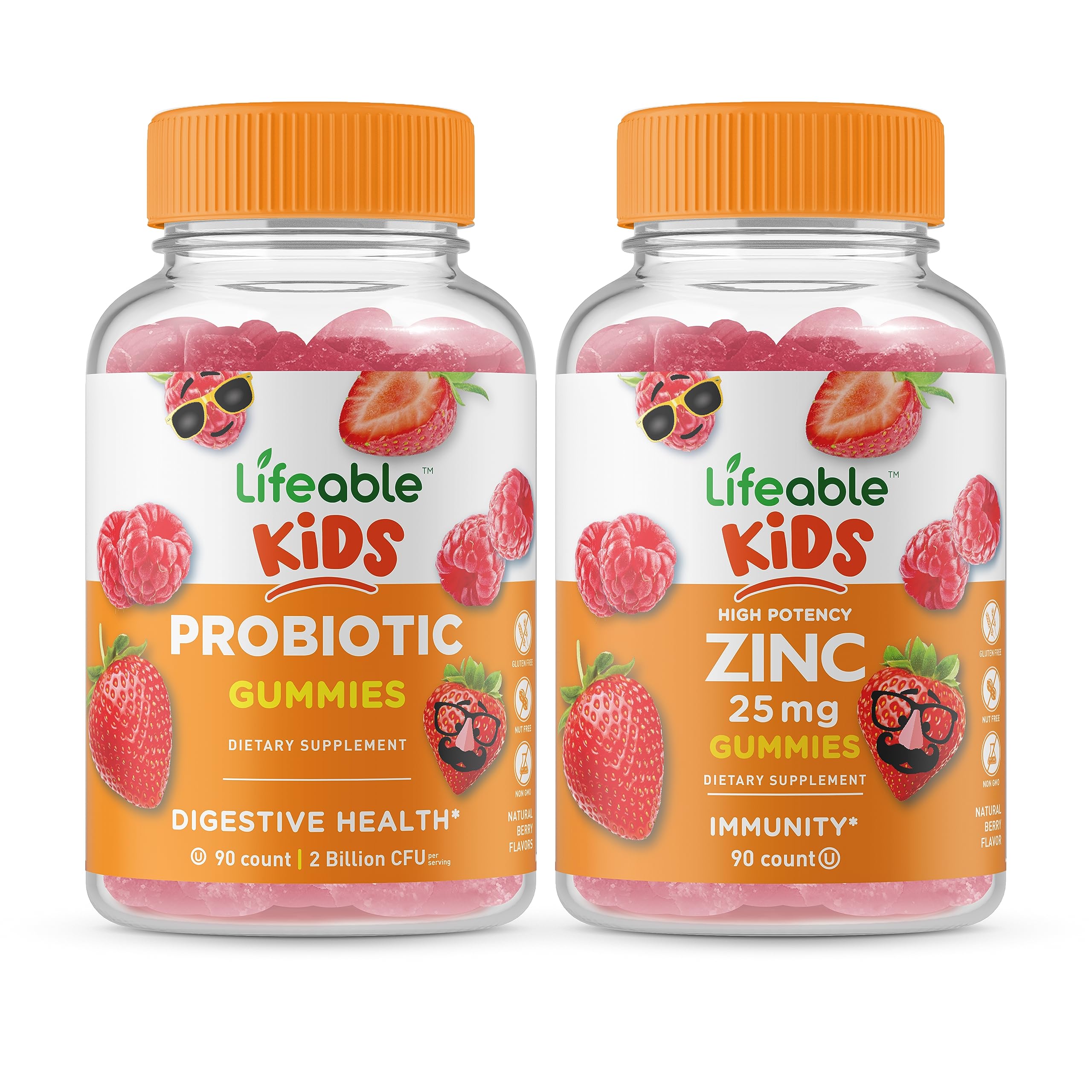 Lifeable Probiotic 2 Billion CFU Kids + Zinc 25mg Kids Gummies Bundle - Great Tasting Vitamin Supplement Gluten Free GMO Free Chewable Gummy