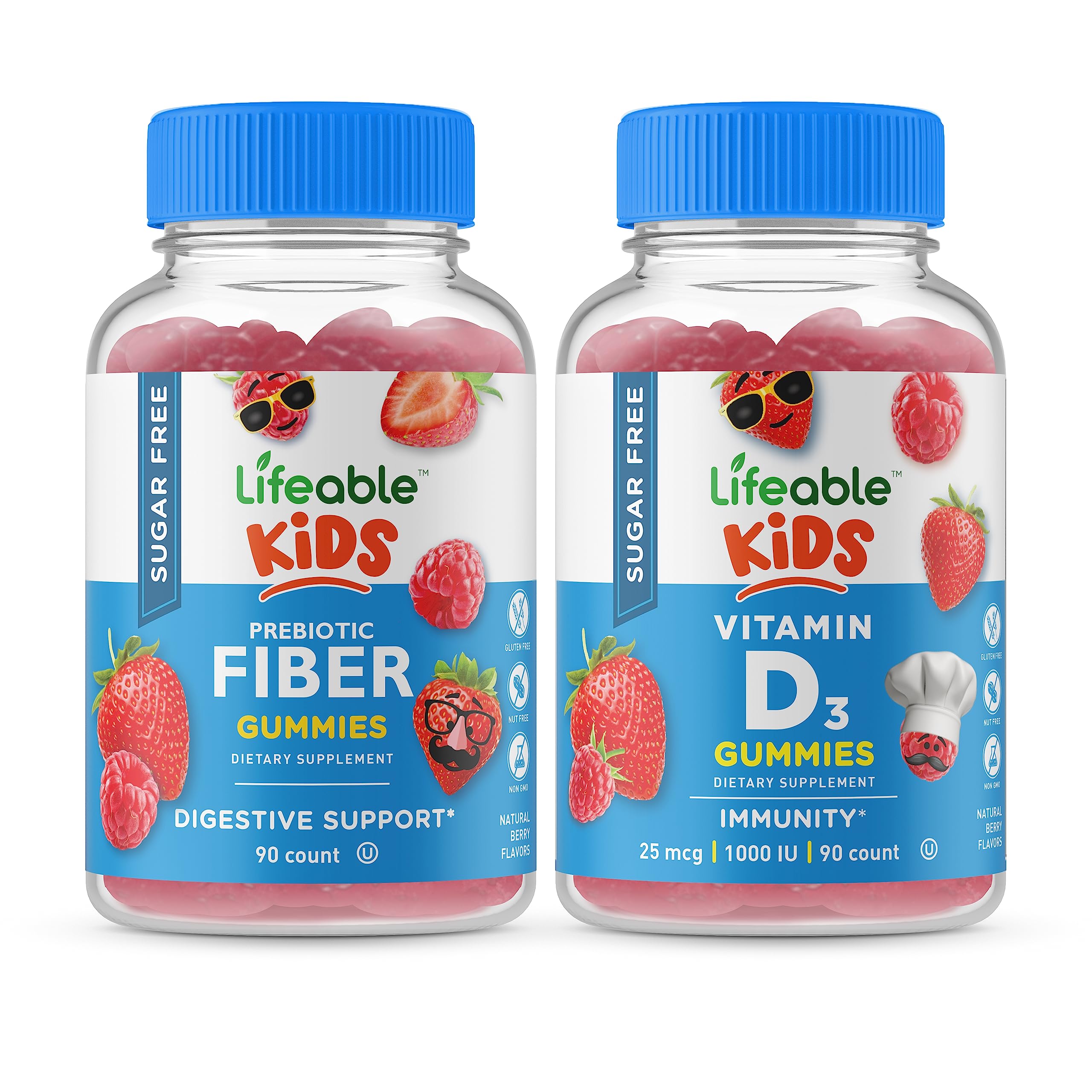 Lifeable Sugar Free Preciotic Fiber Kids + Vitamin D Kids Gummies Bundle - Great Tasting Vitamin Supplement Gluten Free GMO Free Chewable Gummy