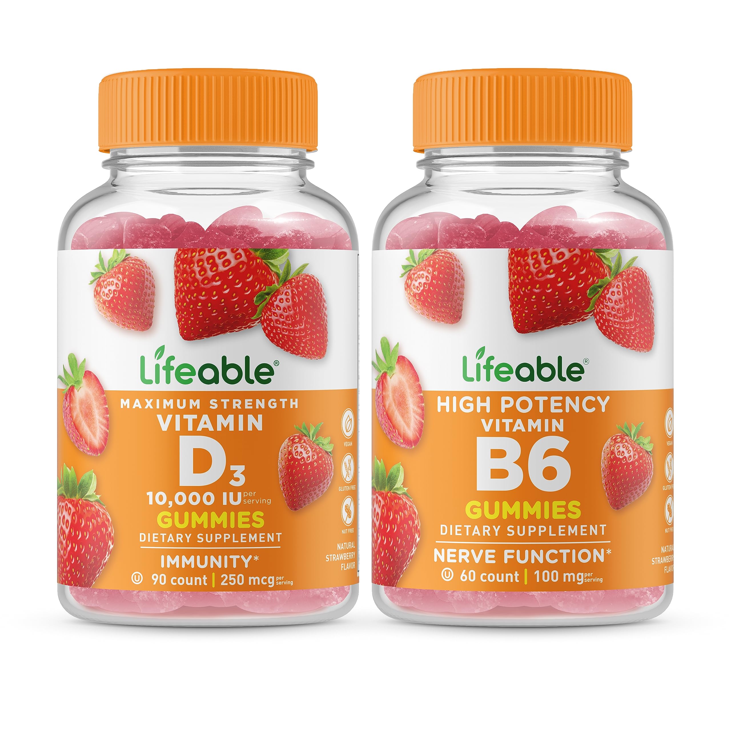 DOCTOR RECOMMENDED: Lifeable spends thousands of hours on research, testing, and analyzing each of our products. Our entire line of supplements is backed with the approval of a renowned family doctor. GREAT TASTING GUMMIES: These gummies have great flavors everyone loves they are pleasant and easy to chew you'll find yourself reaching for more. NATURAL FLAVORED AND VEGETARIAN: These Vegetarian gummies by Lifeable are certified non-GMO, gluten-free, dairy-free, and free of peanuts. Kosher and Halal. LIFEABLE VITAMIN B6 CONTAINS 100mg PER SERVING: Each serving consists of 2 jellies with a total of 100 mg of B6 vitamin (as Pyridoxine Hydrochloride). This bottle contains 60 gummies, equaling 30 servings. Adults are recommended to take 2 gummies per day. These vitamins are suitable for kids age 2 , too. LIFEABLE VITAMIN D 10000 IU CONTAINS 10,000 IU – 250 MCG PER SERVING: Each serving consists of 2 jellies. This bottle contains 90 gummies, equaling 45 servings. Adults are recommended to take 2 gummies per day.