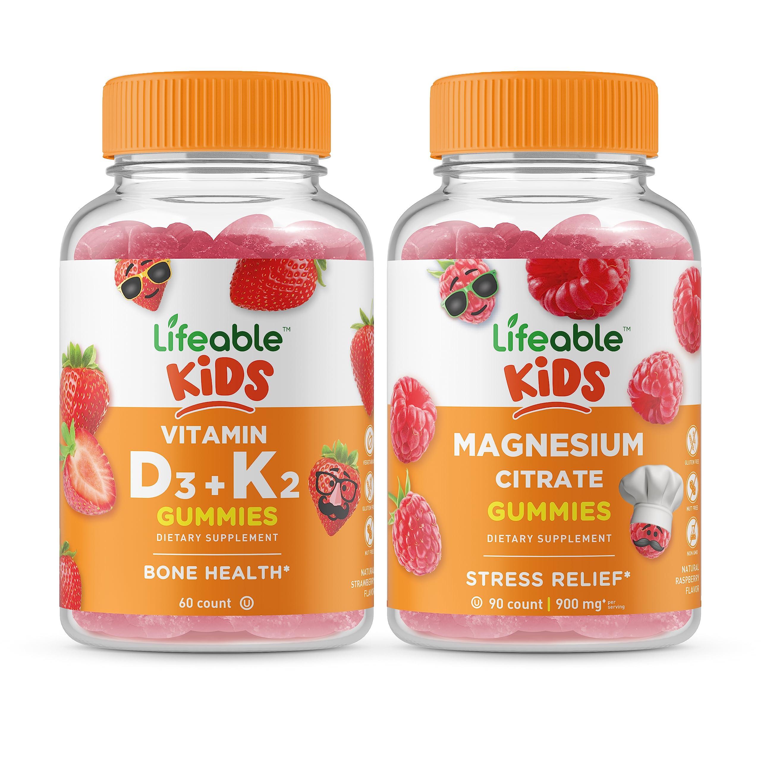 GREAT TASTING GUMMIES: These gummies have great flavors everyone loves they are pleasant and easy to chew you'll find yourself reaching for more. NATURAL FLAVORED AND VEGETARIAN: These Vegetarian gummies by Lifeable are certified non-GMO, gluten-free, dairy-free, and free of peanuts. Kosher and Halal. LIFEABLE MAGNESIUM KIDS CONTAINS 900 MG PER SERVING: Each serving is 3 jellies, with a total 900 mg of magnesium citrate. Children should take 3 gummies per day. The bottle contains 90 pieces for 30 servings also suitable for adults too. LIFEABLE VITAMIN D3 VITAMIN K2 KIDS CONTAINS VITAMIN D 1000 IU VITAMIN K 100 mcg: Each serving contains 1000 IU - 25 mcg vitamin D-3 and 100 mcg vitamin K-2 MK7. This bottle contains 60 gummies, with 2 gummies per serving, equaling 30 servings. These vitamins are suitable for kids age 2 , too.