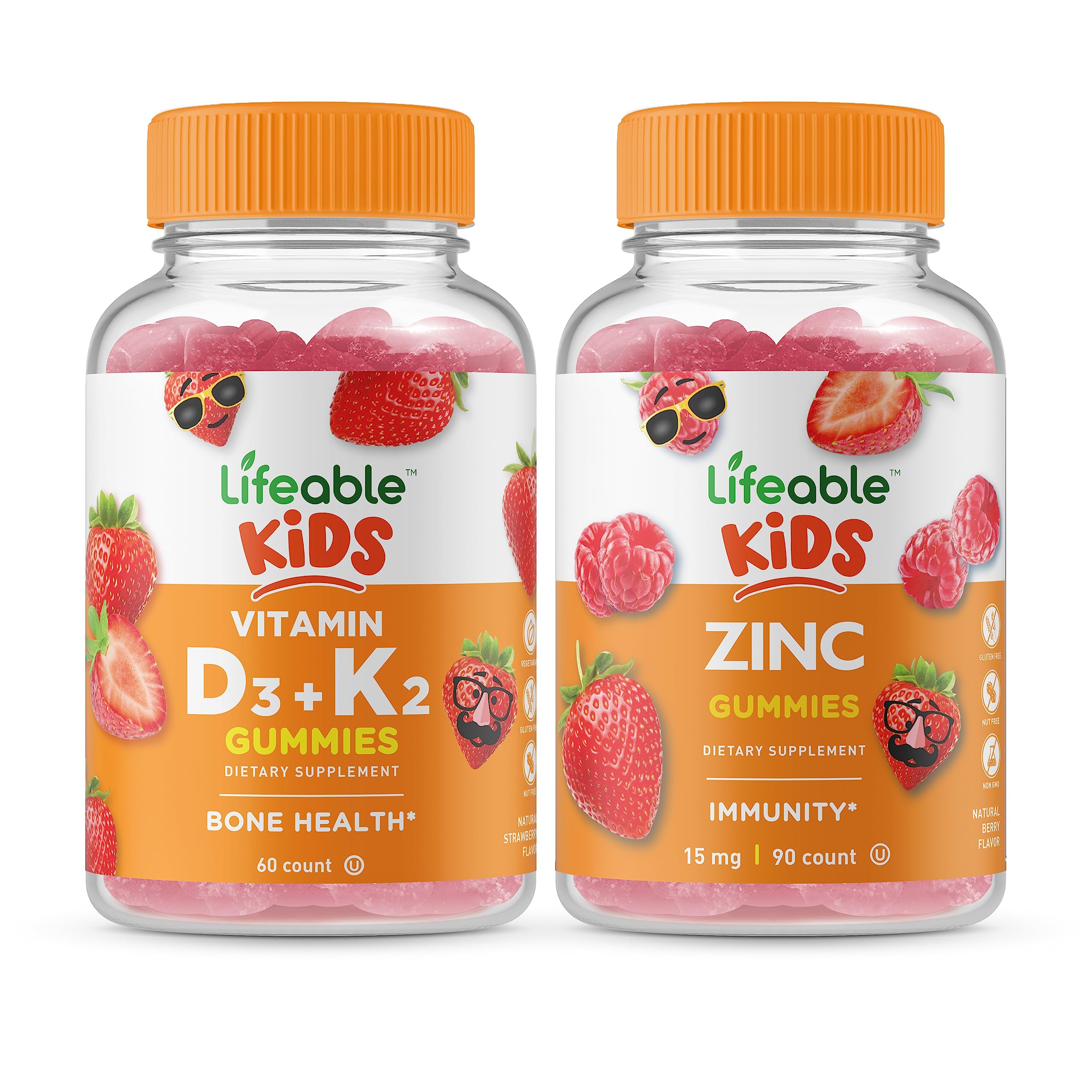 GREAT TASTING GUMMIES: These gummies have great flavors everyone loves they are pleasant and easy to chew you'll find yourself reaching for more. NATURAL FLAVORED AND VEGETARIAN: These Vegetarian gummies by Lifeable are certified non-GMO, gluten-free, dairy-free, and free of peanuts. Kosher and Halal. LIFEABLE ZINC KIDS CONTAINS 15 MG PER SERVING: This bottle contains 90 gummies, 90 servings. Each serving has 15 mg of zinc. Kids are recommended to take 1 gummy per day. These gummies are suitable for adults, too. LIFEABLE VITAMIN D3 VITAMIN K2 KIDS CONTAINS VITAMIN D 1000 IU VITAMIN K 100 mcg: Each serving contains 1000 IU - 25 mcg vitamin D-3 and 100 mcg vitamin K-2 MK7. This bottle contains 60 gummies, with 2 gummies per serving, equaling 30 servings. These vitamins are suitable for kids age 2 , too.