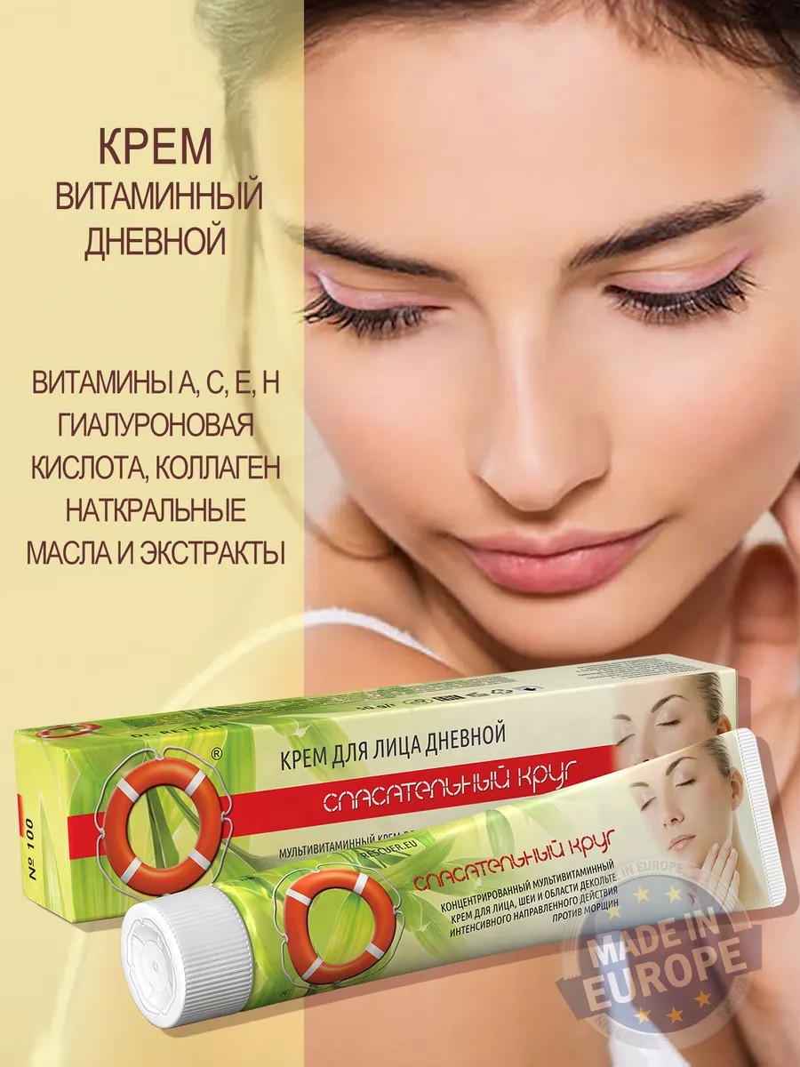 Спасательный круг - Мультивитаминный крем для лица, шеи и области декольте против морщин 50гр. Активные ингредиенты: витамин А (ретинол), витамин Е, витамин С, витамин Н (биотин), масло миндальное, масло макадамия, гиалуроновая кислота, UV-фильтр. Крем для ежедневного ухода за любым типом кожи лица, шеи и области декольте, а также интенсивного воздействия и разглаживания глубоких морщин. Крем обладает легкой, быстро впитывающейся консистенцией, в результате применения которой, кожа становится более свежей, гладкой, нежной и здоровой. Активные ингредиенты препарата нормализуют обменные процессы восстановления клеток кожи, повышают эластичность и упругость кожи, улучшают цвет лица. Препарат эффективно стимулирует процессы синтеза собственного коллагена кожи, нормализует содержание гиалуроновой кислоты и восстанавливает естественную молодость и здоровое состояние кожи. Комплекс активных компонентов смягчает, питает и разглаживает кожу лица, стимулирует биологическую энергию клеток кожи. UV-фильтр защищает от вредного воздействия на кожу ультрафиолетовых солнечных лучей.