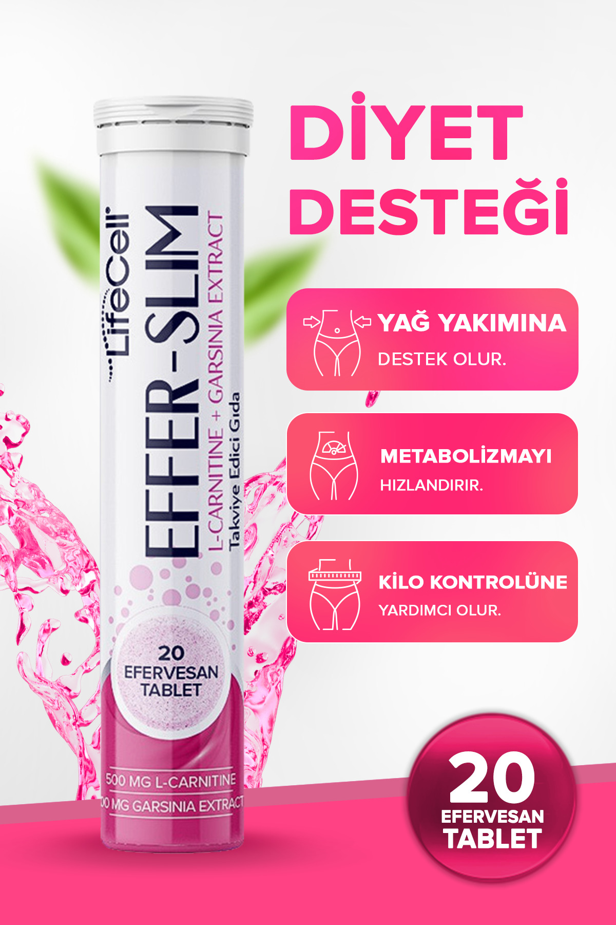 A food supplement containing L-Carnitine, Garcinia, and Chromium. The vitamins and minerals it contains contribute to body functions. L-Carnitine and Garcinia components aid in the diet process. Its water-soluble tablet form offers easy use. Contains 20 effervescent tablets.