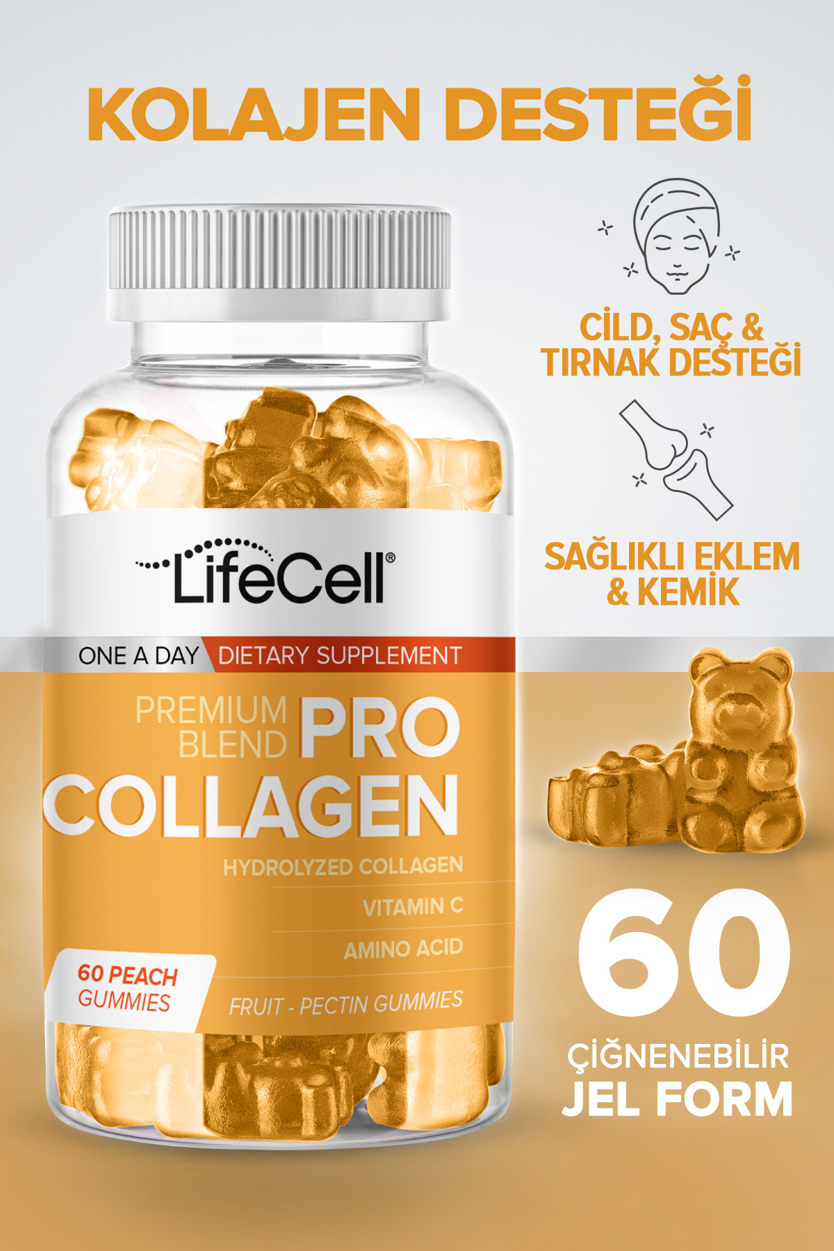Pro Collagen - 60 Gummy Multivitamin Skin Care Food Supplement Containing Hydrolyzed Collagen and Vitamin C. LifeCell Pro Collagen is a food supplement containing hydrolyzed collagen, vitamin D3, and complex amino acids. It increases skin elasticity and moisture retention capacity. It has an anti-aging effect by helping to reduce wrinkles and signs of aging on the skin. The Vitamin C it contains contributes to normal collagen formation, which is necessary for the normal function of bones, cartilage, skin, gums, and teeth. The chewable gel form offers a delicious and easy-to-use formula. Contains 60 Gummy pieces. Directions for Use: It is recommended to consume one gummy twice a day, once in the morning and once in the evening. Suitable for use on an empty or full stomach. Ingredients: Hydrolyzed Collagen - 200 mg L-Ascorbic acid - 80 mg L-isoleucine - 30 mg L-leucine - 30 mg L-valine - 20 mg L-lysine - 20 mg Histidine - 20 mg L-methionine - 20 mg L-phenylalanine - 20 mg L-threonine - 20 mg L-tryptophan - 20 mg Vitamin D3 - 5 µg