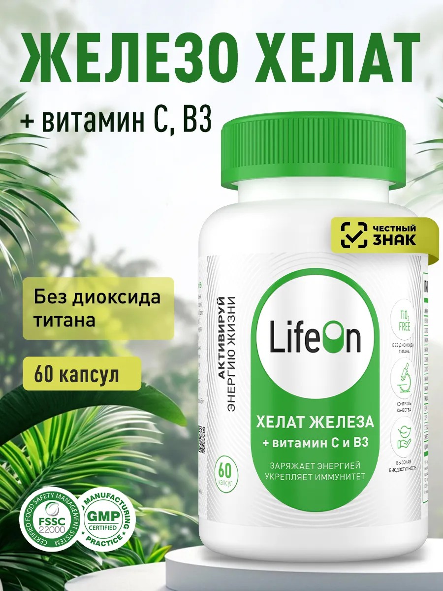 Lifeon Железо бисглицинат с витаминами С и В3, 60 капсул