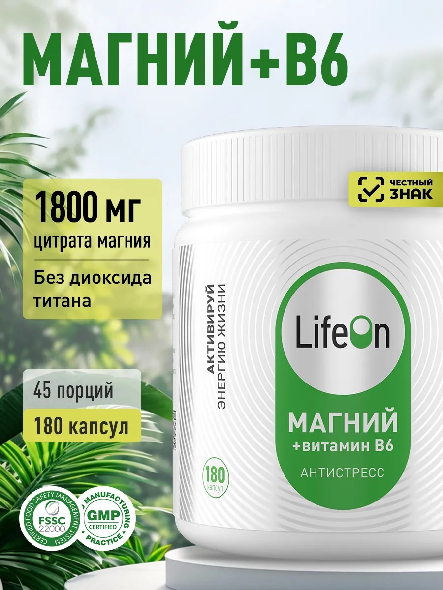 Lifeon Магний + Витамин В6, 180 капсул